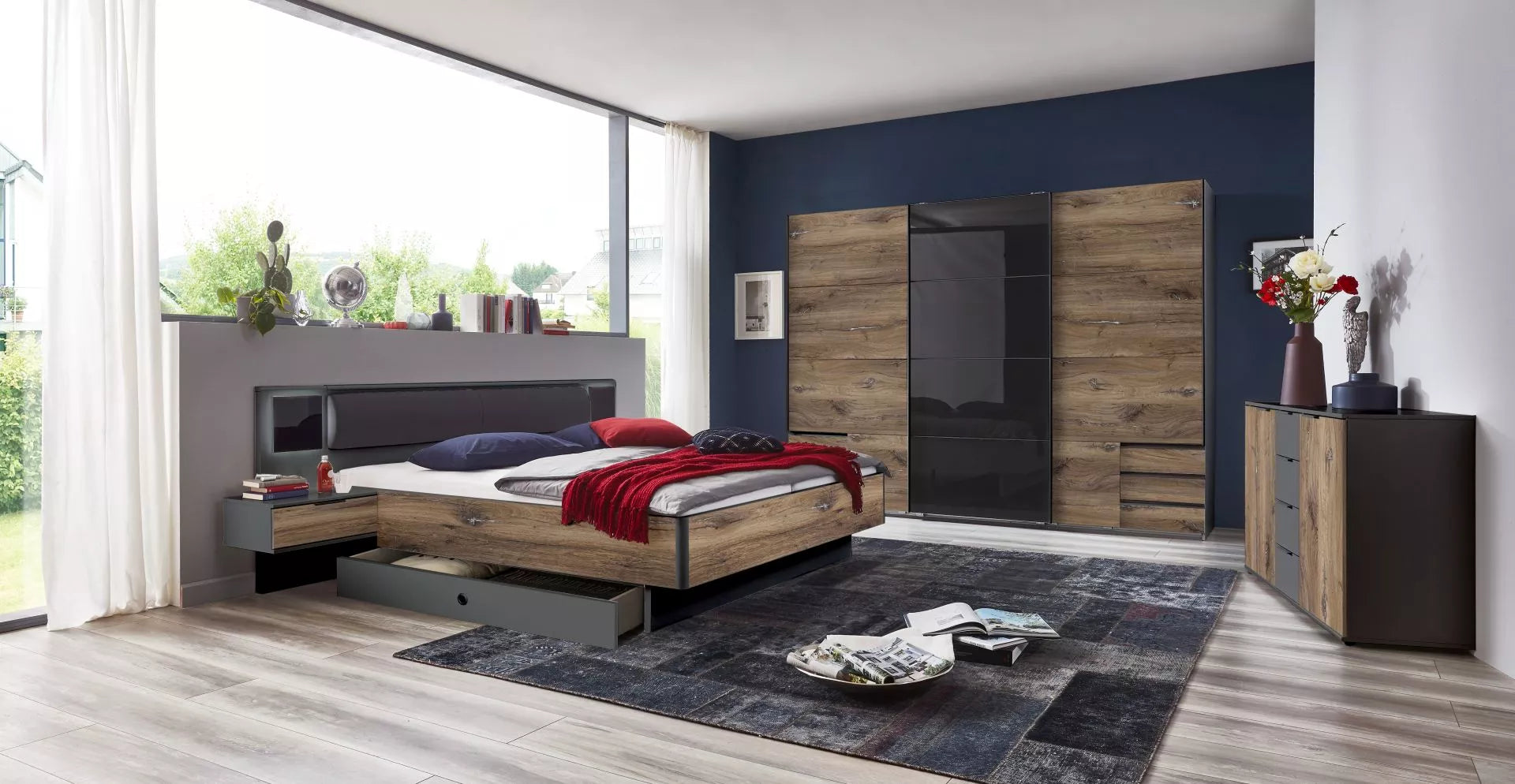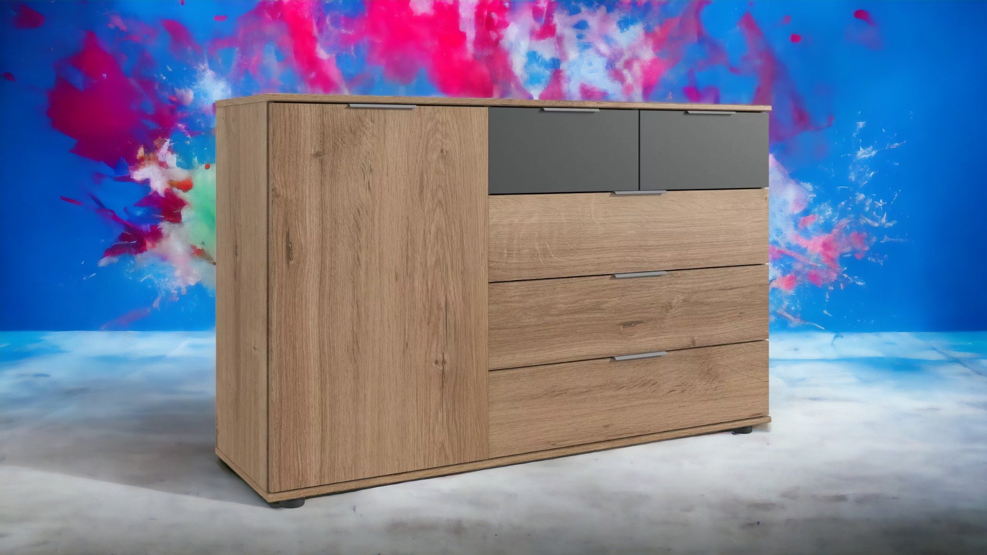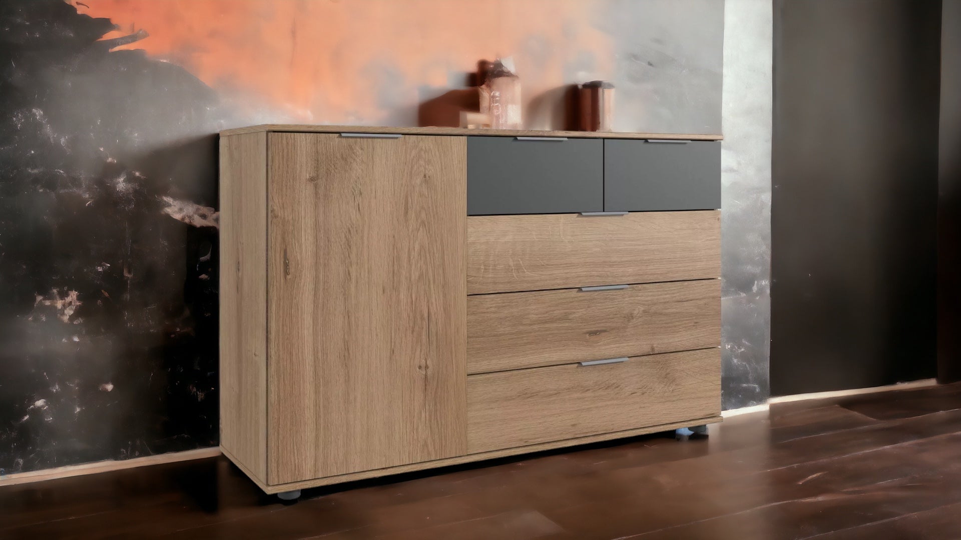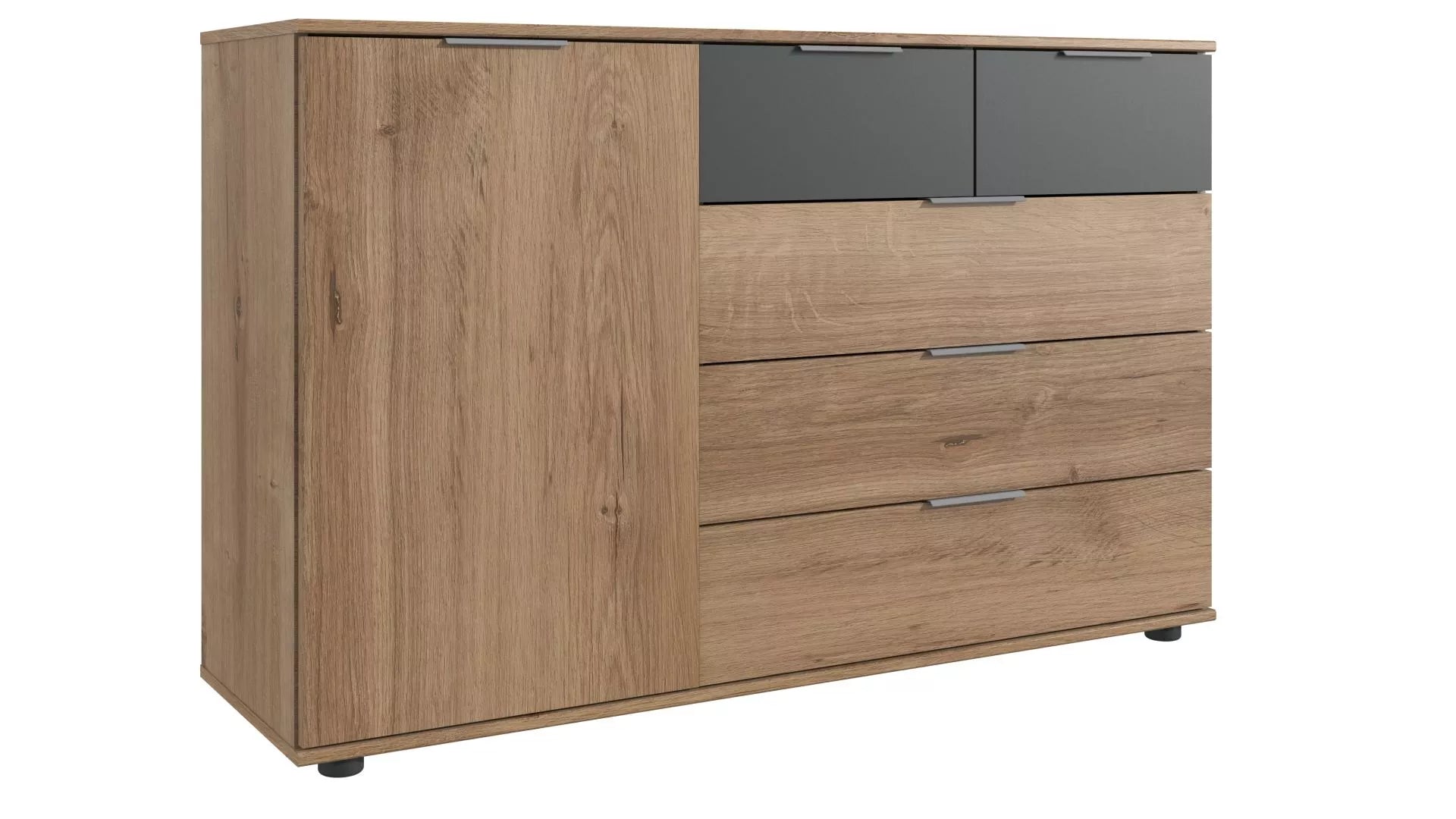 Tür links, rechts 5 Schubladen, Inkl. 2 Einlegeböden. Dekor: Plankeneiche-Nachbildung, Abs. Graphit.