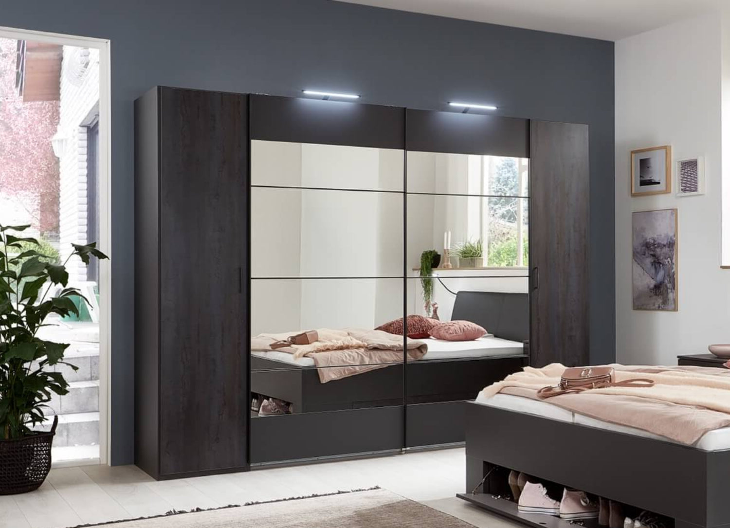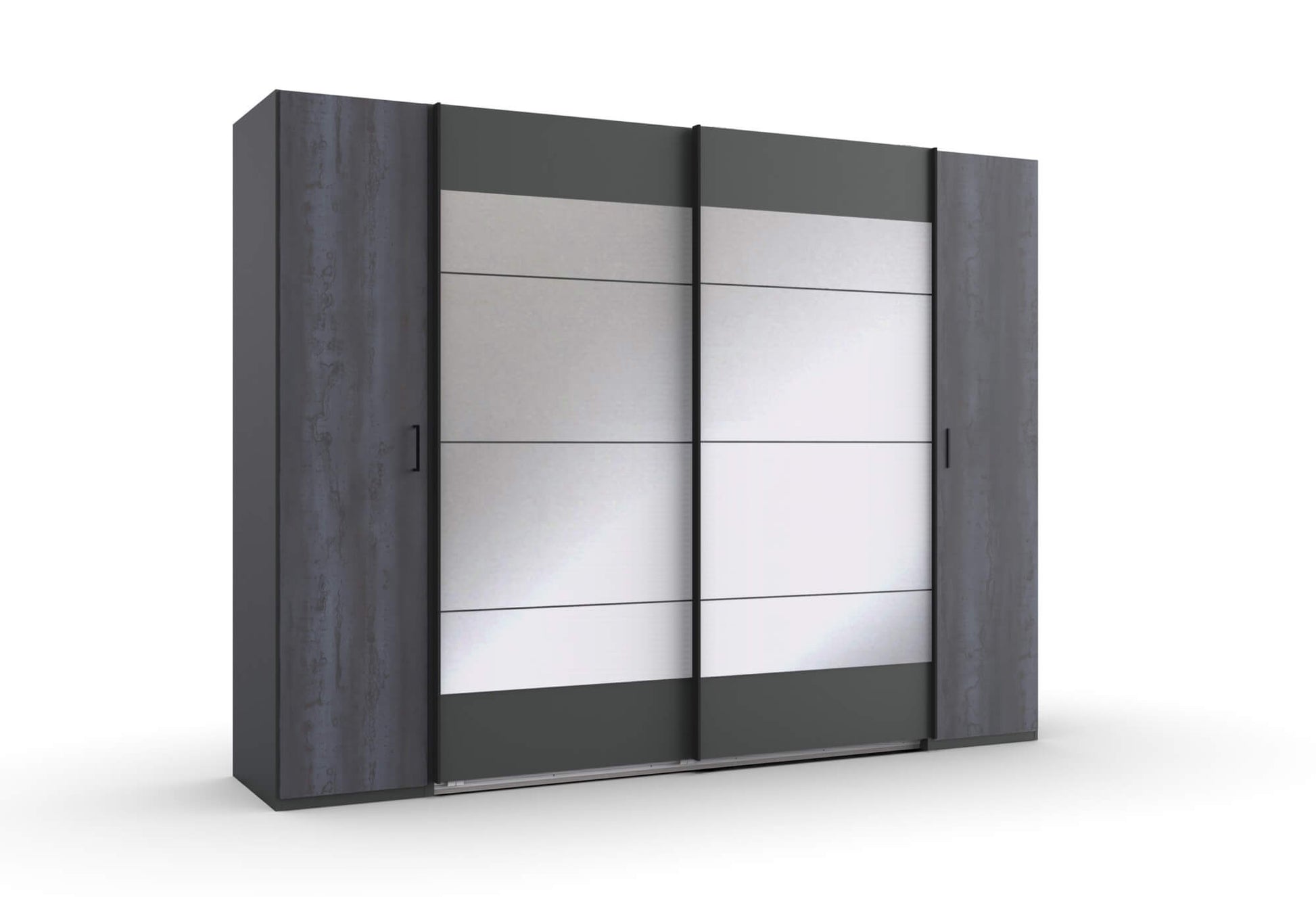 4 Abteilungen inkl. Seiten ca.: 45/90/90/45 cm, inkl. 10 Einlegeböden + 2 Kleiderstangen, Front Digi-steel Optik, Korpus + Abs. Graphit.