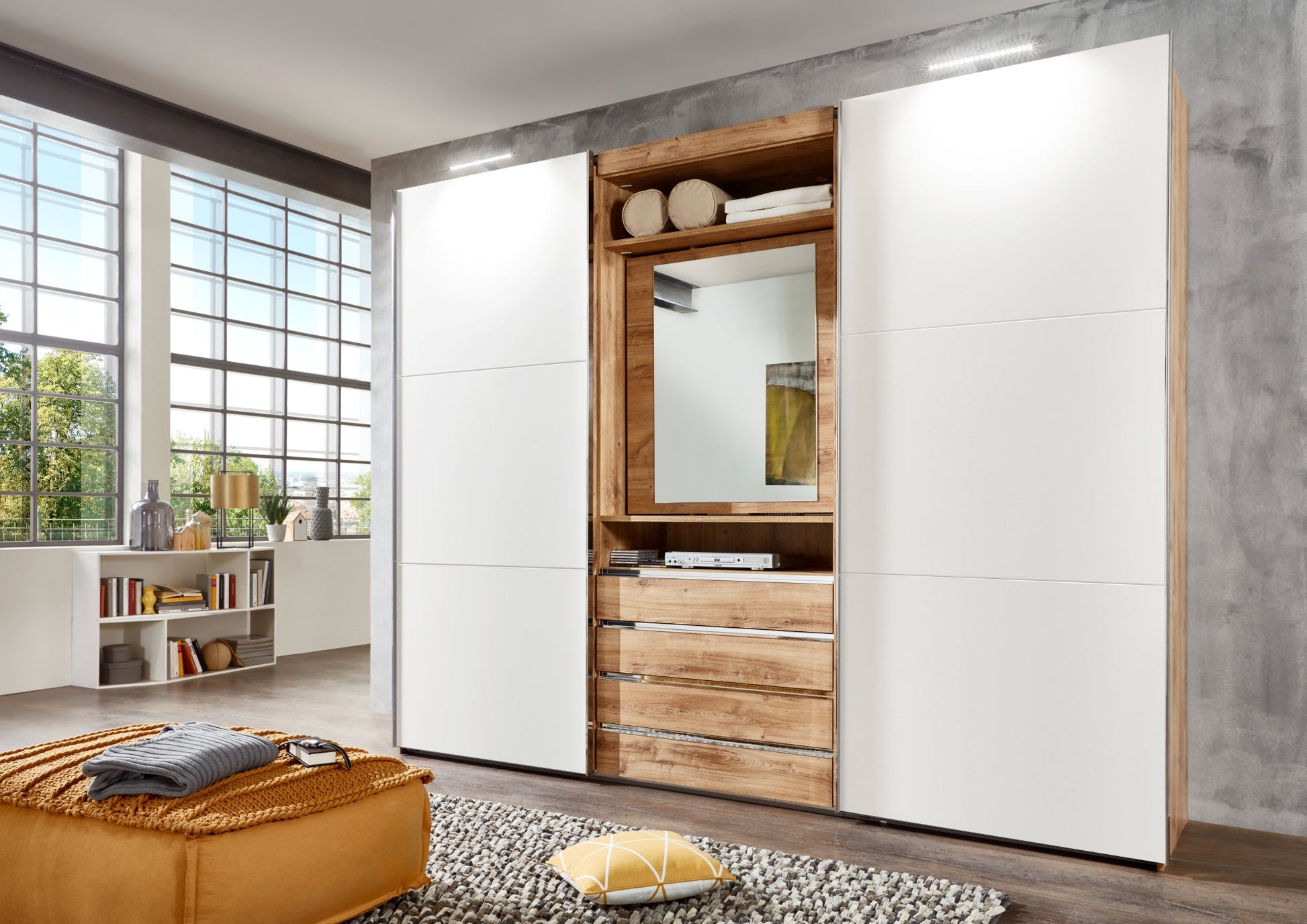 Erleben Sie die Faszination des Wimex Funktions-Spiegel-Schwebetürenschrank Magic! Machen Sie Ihren Kleiderschrank zum VIP-Abenteuer mit moderner Funktionalität und 4 praktischen Schubladen. Mit einer beeindruckenden Höhe von 236 cm bietet dieser Schrank viel Platz für Ihre Kleidung und Accessoires. Sein Holzdekor verleiht Ihrem Raum einen Hauch von Eleganz und Abenteuer. Das zentrale offene Fach mit drehbarem Spiegel-Element bietet eine einzigartige Herausforderung. Wählen Sie aus 4 spannenden Farbvarianten. B/H/T 300 x 236 x 65 cm!