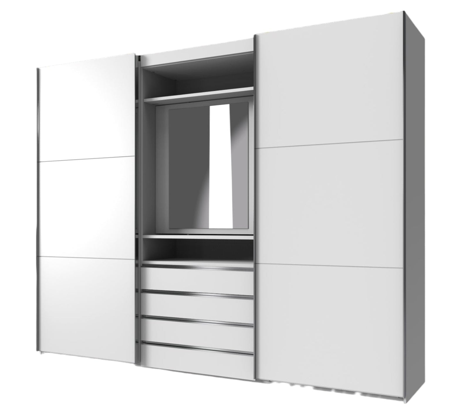 3 Abteilungen inkl. Seiten ca. 100/100/100 cm, mittig oben offenes Fach + drehbares Spiegel-Element, variabel rechts/links angeschlagen montierbar, 5 Einlegeböden + 2 Kleiderstangen, 4 Schubladen. Dekor: Korpus und Front Weiß.