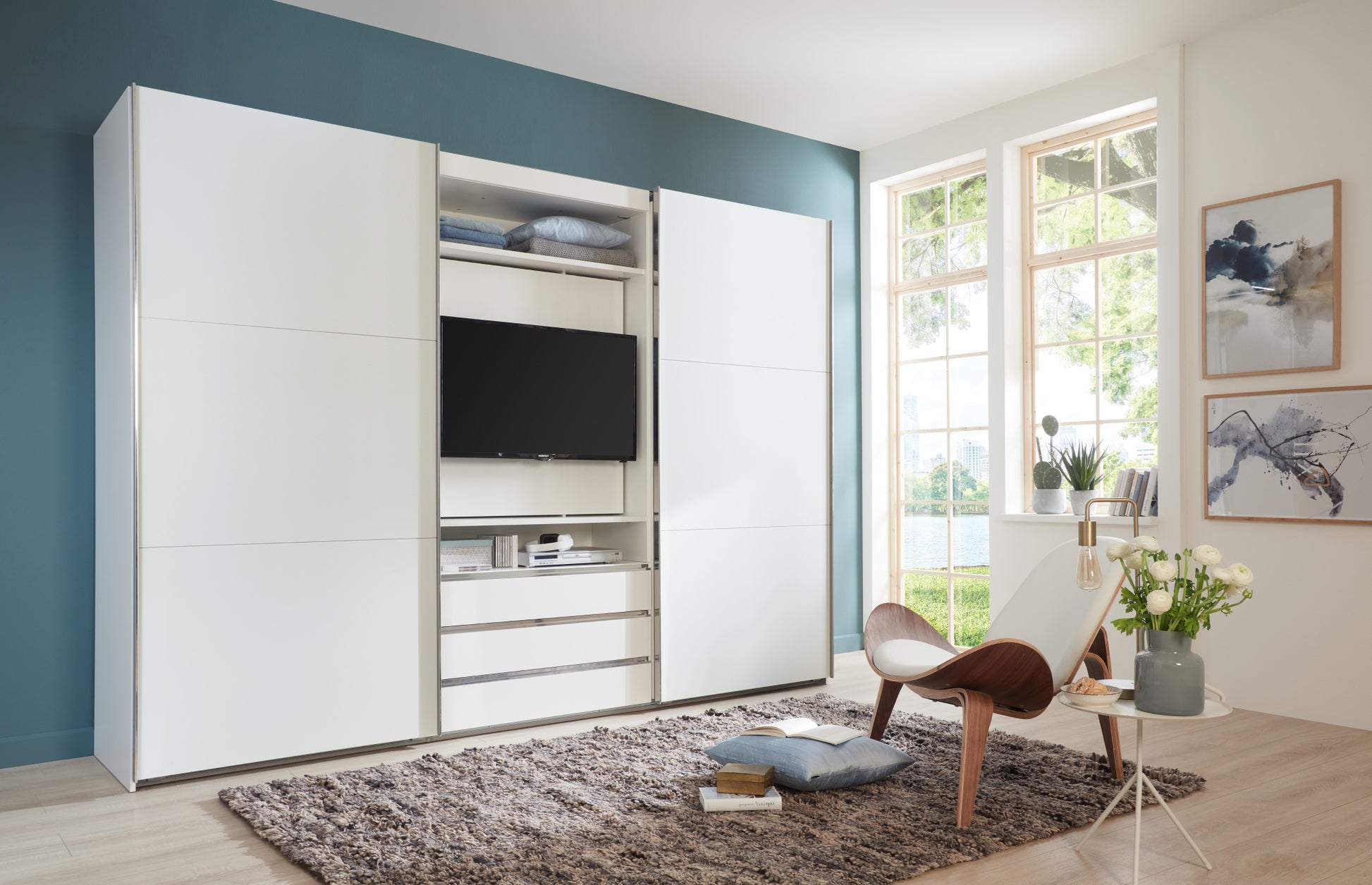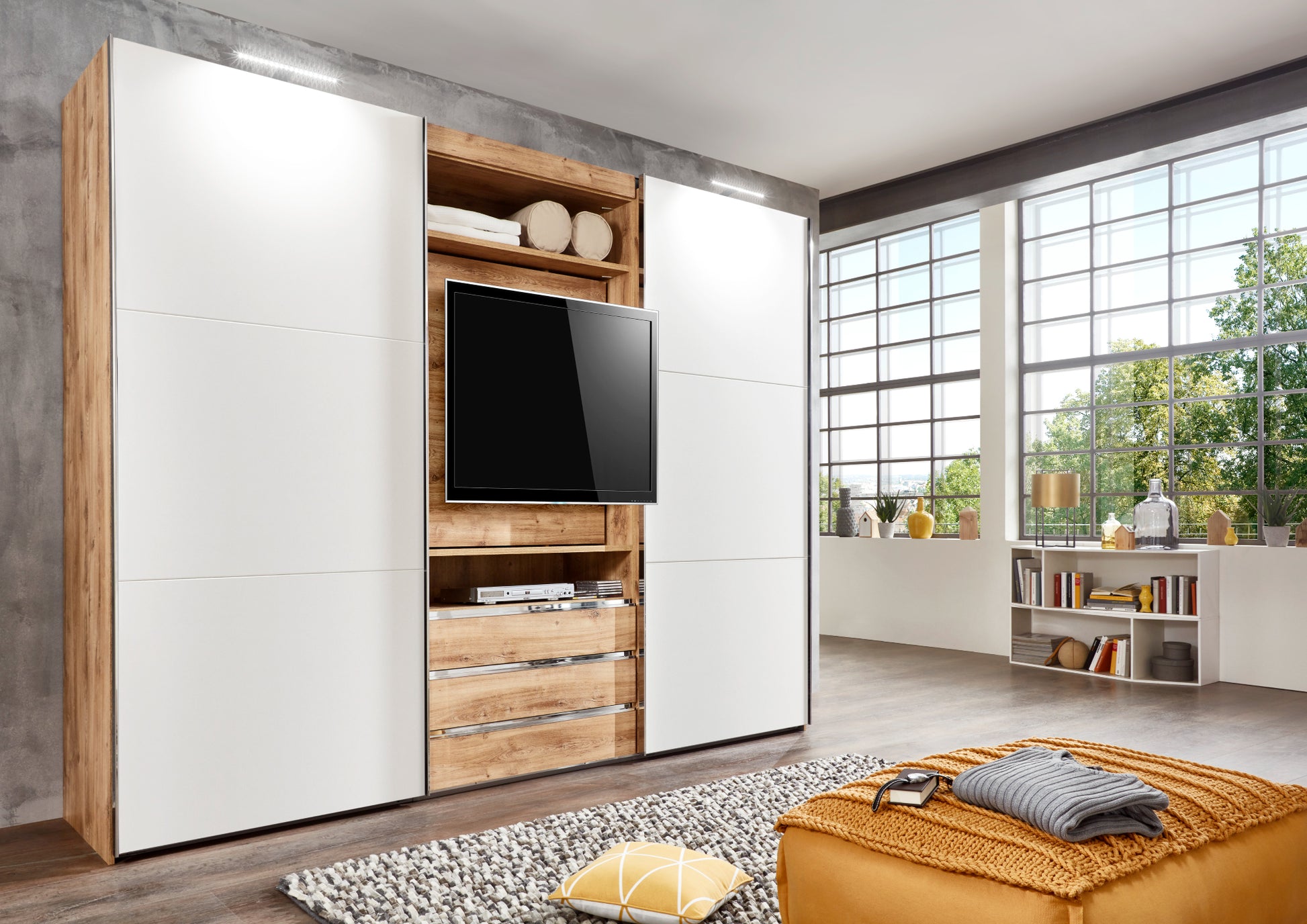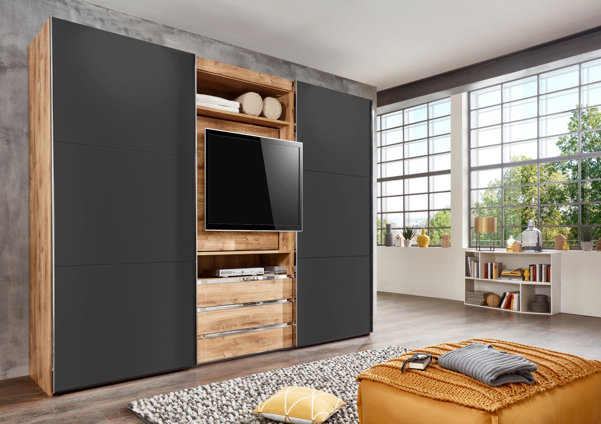 Erleben Sie die Magie des modernen Wimex Funktions-TV-Schwebetürenschranks! Mit seinen ca. 300 x 216 x 65 cm bietet er viel Platz für Ihre elektronischen Geräte und sorgt für eine moderne und praktische Schlafzimmer. Mit 3 Schubladen und einem mittig offenen Fach, das ein drehbares TV-Element beherbergt, bietet er reichlich Stauraum und Funktionalität. In 4 Farbenvarianten erhältlich und mit einem integrierten TV ist er die ideale Lösung für ein entspanntes Fernseherlebnis im Schlafzimmer. B/H/T 300 x 216 x 65 cm. Lassen Sie sich von seinem Holzdekor verzaubern und wagen Sie das Abenteuer der Einrichtung mit Stil!