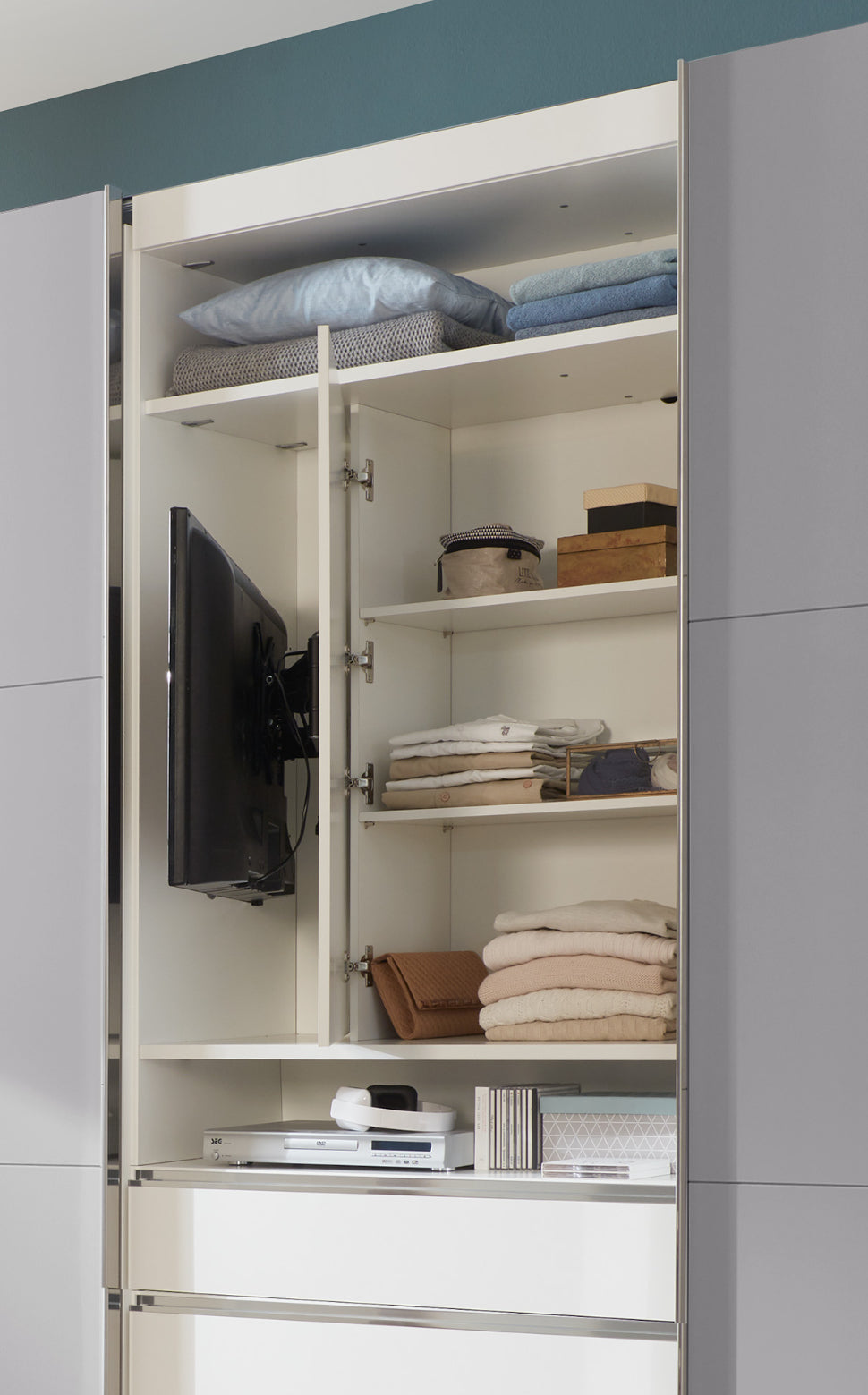 Für noch mehr Komfort können Sie Ihren Schrank mit folgendem Zubehör ergänzen: zusätzliche Einlegeböden, Wäscheeinteilung oder LED-Kleiderschrankbeleuchtung.