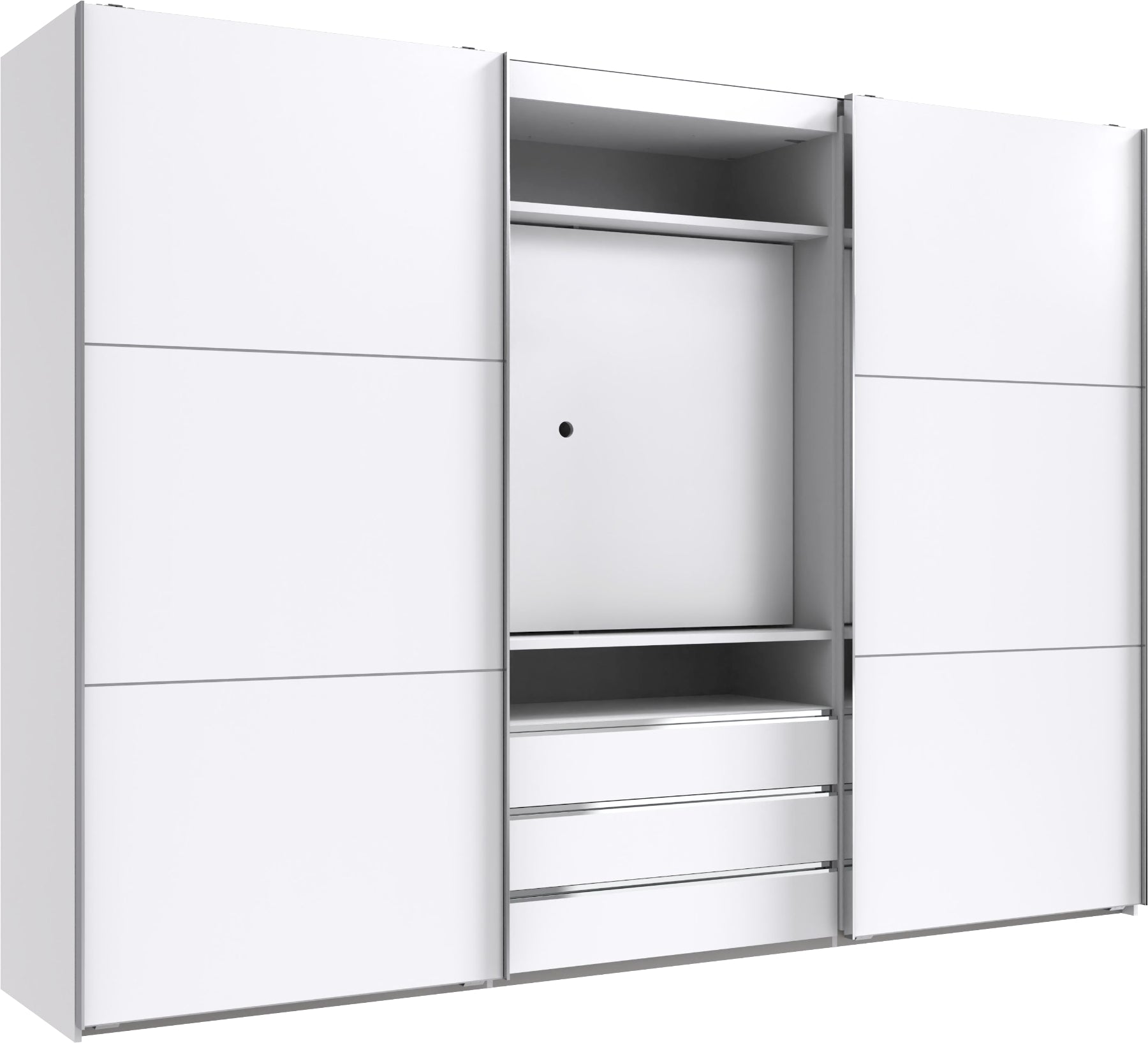 3 Abteilungen inkl. Seiten ca.: 100/100/100 cm, mittig oben offenes Fach + drehbares TV-Element, variabel rechts/links angeschlagen montierbar für TV 38 zl, 3 Schubladen, 3 Einlegeböden + 2 Kleiderstangen. Dekor: Korpus und Front Weiß.