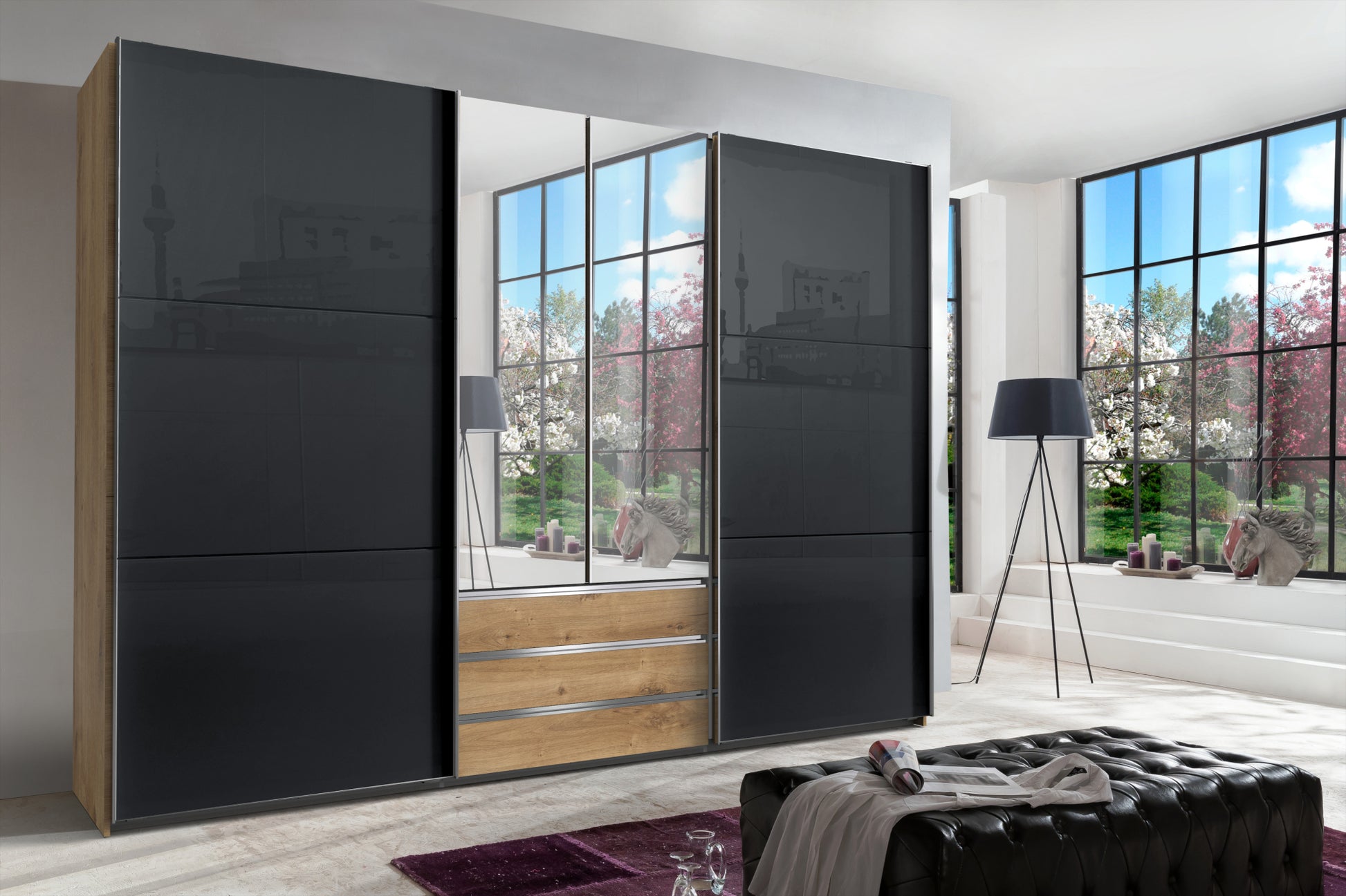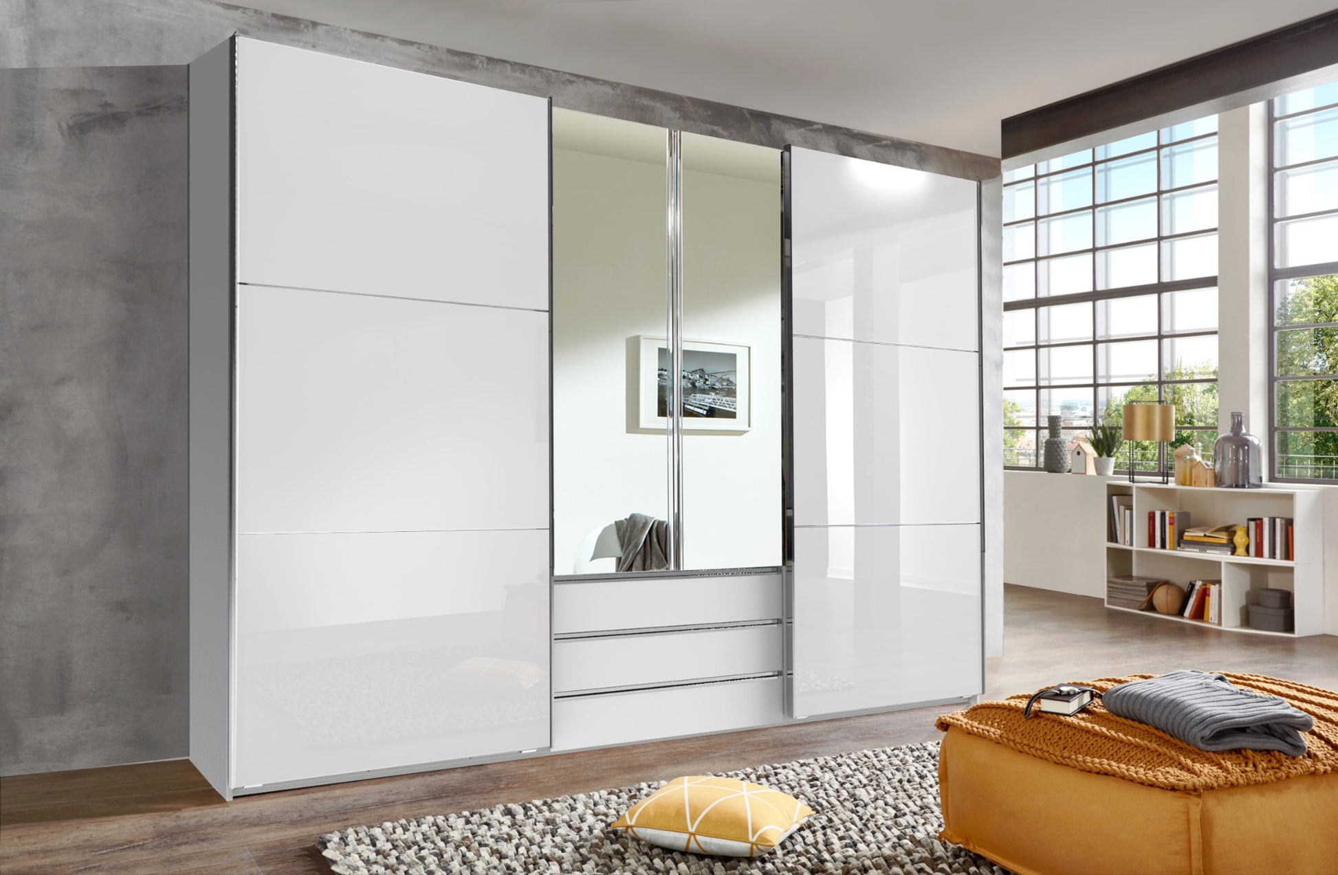 Der Wimex Funktions-Schwebetürenschrank Magic Glas ist VIP auf höchstem Niveau. Mit 3 praktischen Schubladen und mittig 2 eleganten Spiegeltüren, die sich nach außen öffnen, bietet er nicht nur modernen Stauraum, sondern auch luxuriösen Stil. Mit 2 Spiegeltüren, um Ihr Zuhause zu vergrößern und Ihr Outfit stilvoll zu präsentieren. Wählen Sie aus 3 Farbenvarianten und genießen Sie die Schönheit der Aussentüren aus Farbglas. B/H/T 300 x 216 x 65 cm.