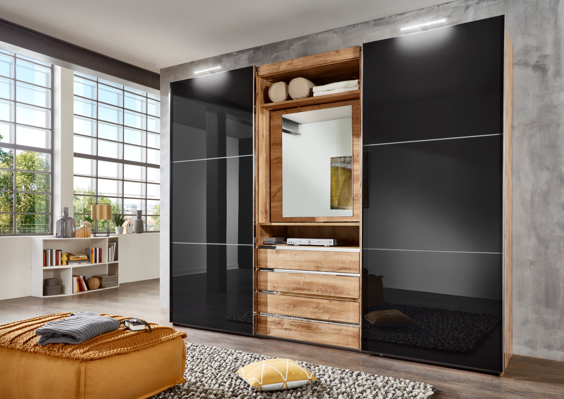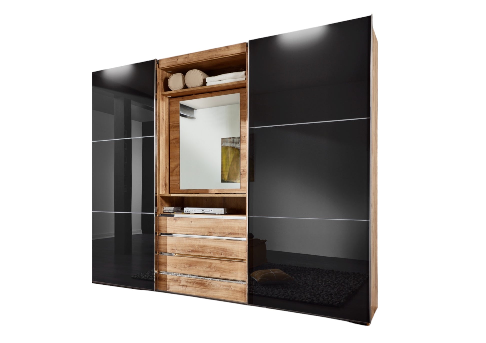 3 Abteilungen inkl. Seiten ca. 100/100/100 cm, mittig oben offenes Fach + drehbares Spiegel-Element, variabel rechts/links angeschlagen montierbar und 4 Schubladen, 5 Einlegeböden + 2 Kleiderstangen. Dekor: Plankeneiche Nachbildung, 2 Aussentüren - Schwebetüren mit Front aus Farbglas Grey.