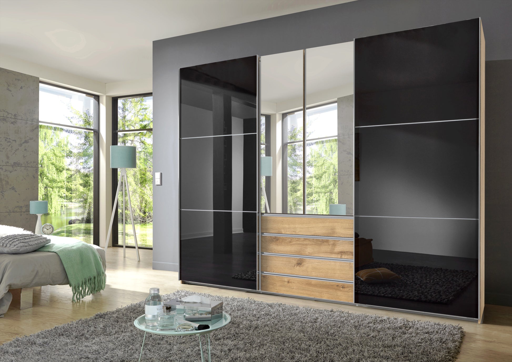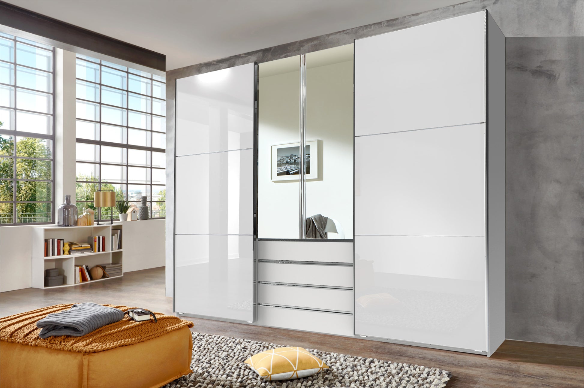 Dieser Wimex VIP Funktions-Schwebetürenschrank verkörpert moderne Eleganz und praktische Raffinesse. Mit einer Höhe von 236 cm bietet er viel Platz für Ihre Kleidung und persönlichen Gegenstände. Die 4 Schubladen und mittig 2 Spiegeldrehtüren sorgen für zusätzlichen Komfort und Stil. Wählen Sie aus 3 Farbenvarianten und genießen Sie die Aussentüren aus Glas, die dem Schrank einen Hauch von Luxus verleihen. B/H/T 300 x 236 x 65 cm.