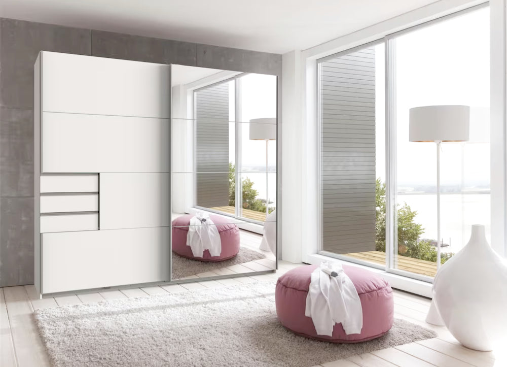 Besonders praktisch: Der Schrank verfügt über integrierte Schubladen für zusätzlichen Stauraum. Eine der Türen ist mit einem großen Spiegel ausgestattet, der Ihrem Raum nicht nur eine optische Vergrößerung verleiht, sondern auch im Alltag sehr nützlich ist. Außerdem gibt es eine Version mit einer Tür aus Glas, die einen modernen Akzent setzt.
