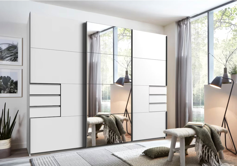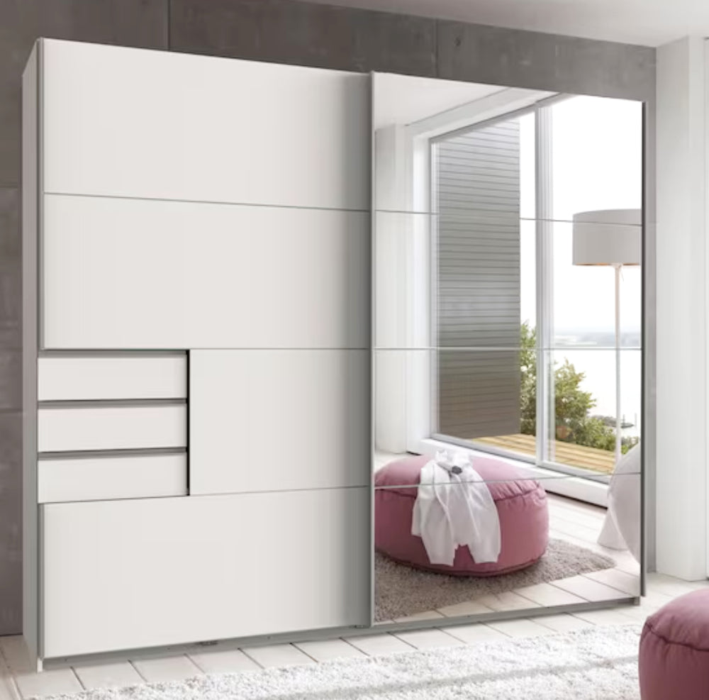 Schwebetürenschrank 2-türig mit 2 Abteilungen inkl. Seiten ca.: 112,5/112,5 cm, inkl. 3 Einlegeböden + 1 Kleiderstange. Dekor: Türfront mit 3 Schubkästen Weiß, durchgängige Türfront Spiegel, Korpus und Rahmen Weiß.