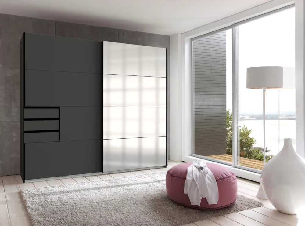 Er ist in zwei stilvollen Farben erhältlich: klassisches Weiß und elegantes Graphit, perfekt für jedes Wohnambiente. Der Schrank ist in Varianten mit zwei oder drei Türen verfügbar, sodass Sie genau das Modell wählen können, das Ihren Bedürfnissen entspricht.