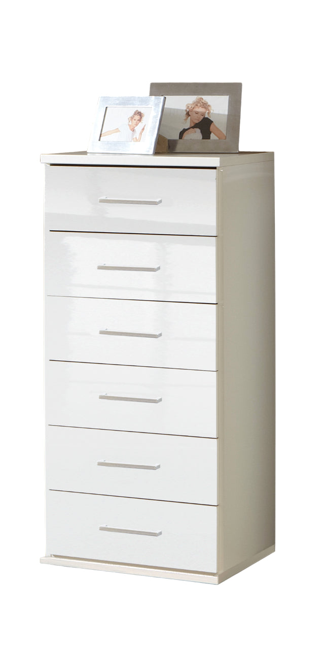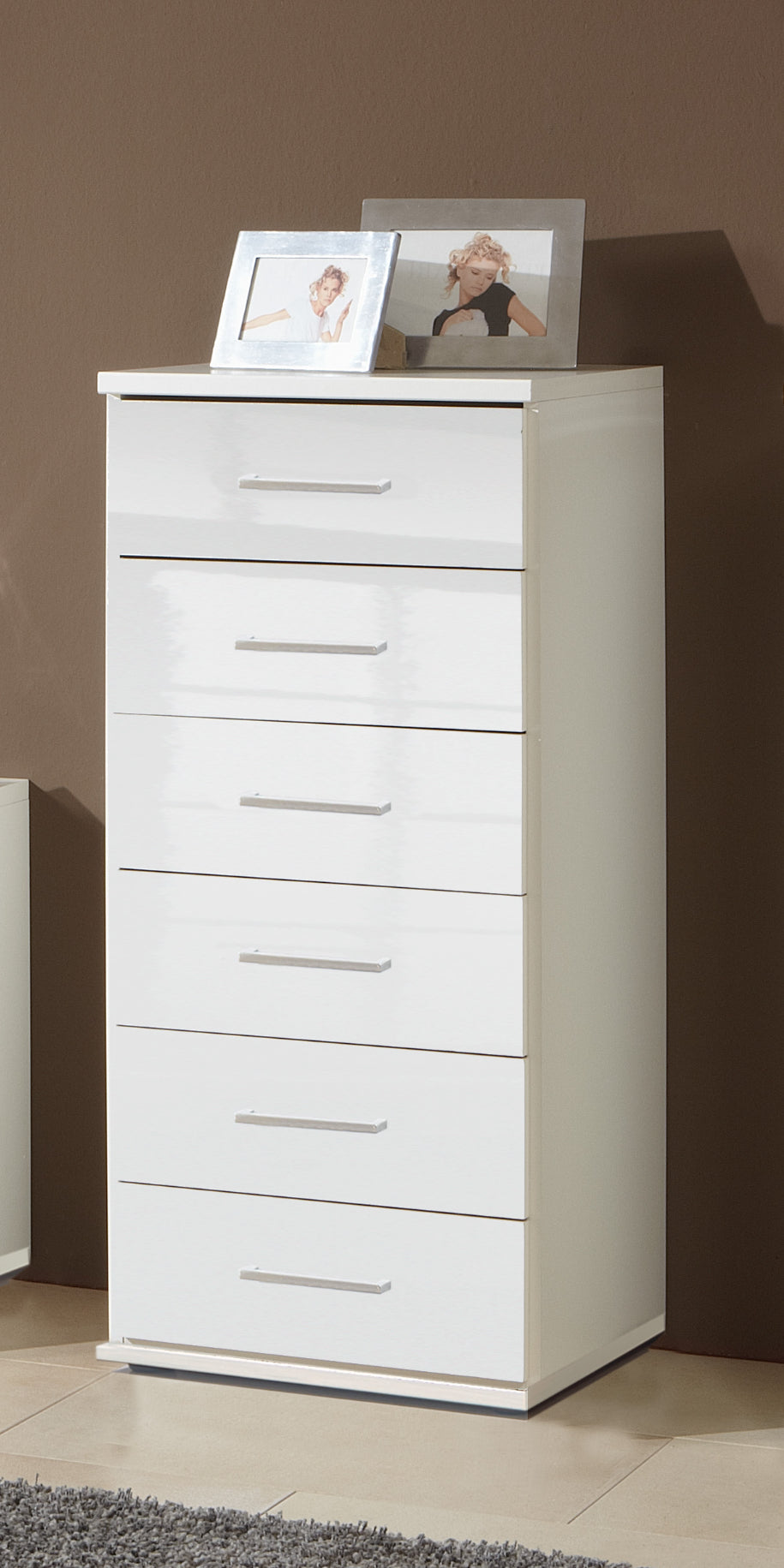 6 Schubladen, Korpus Weiß, Front Hochglanz Lack Weiß.