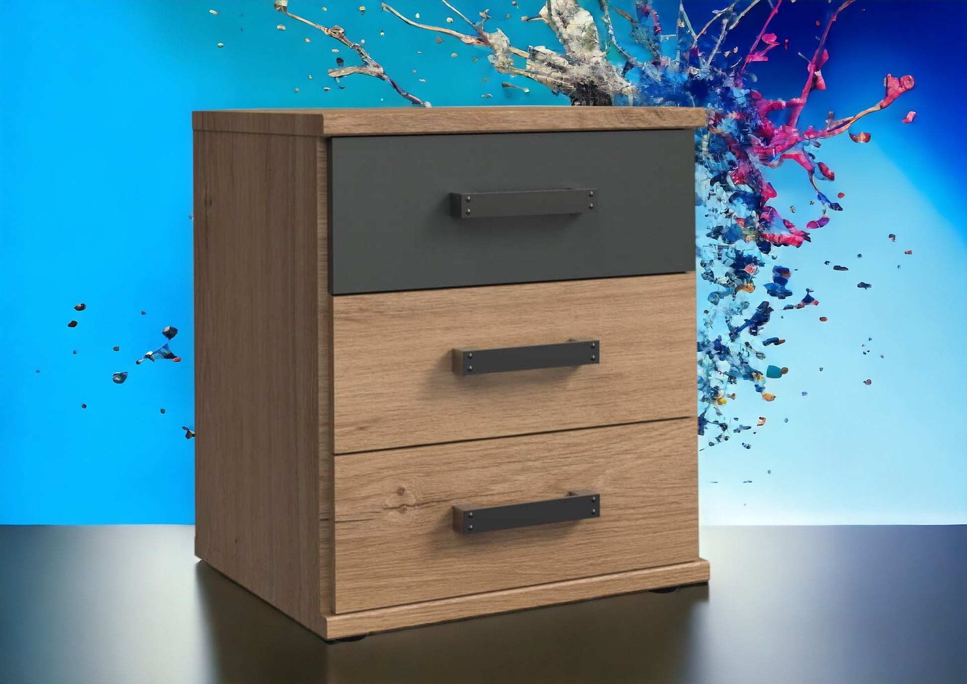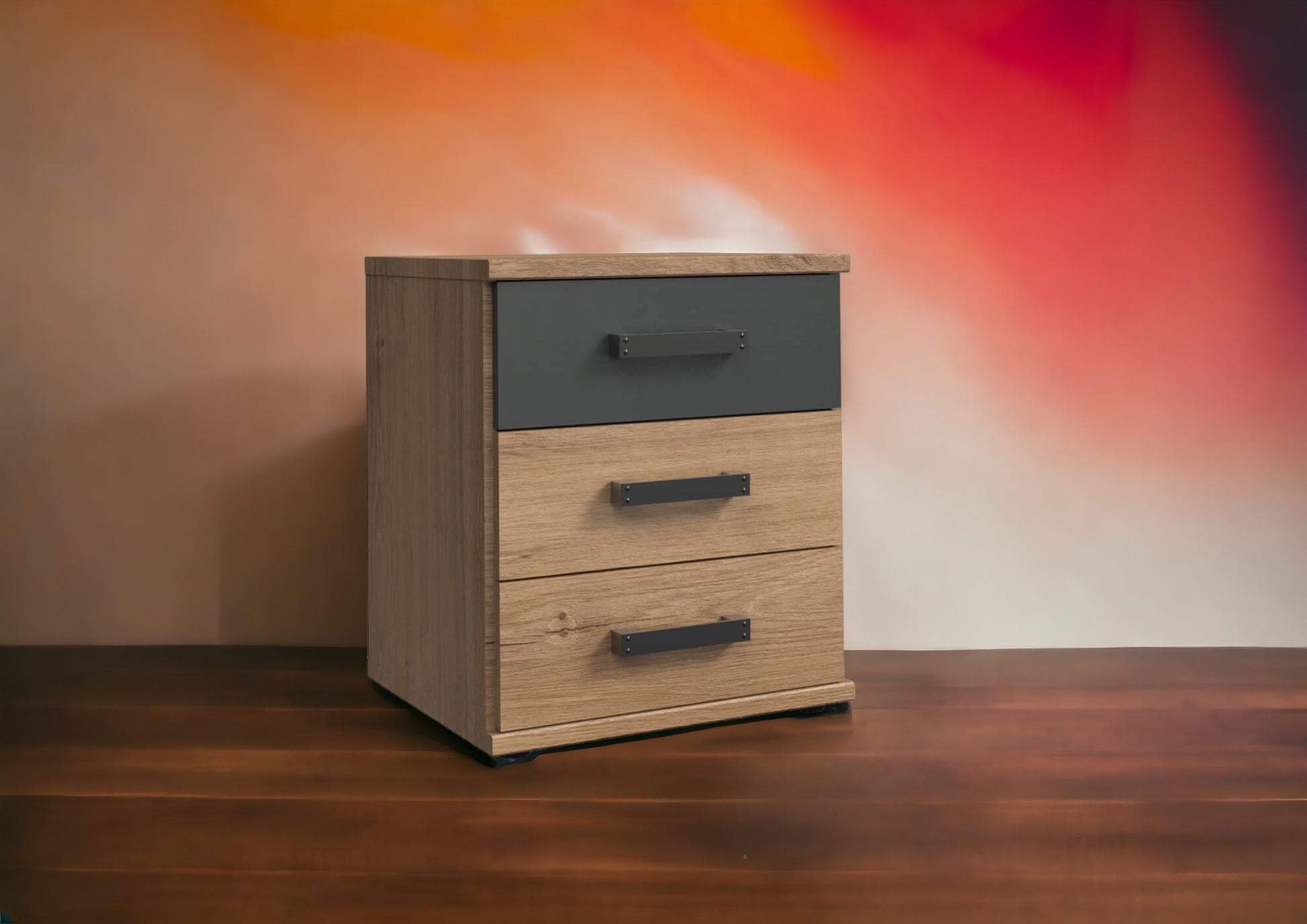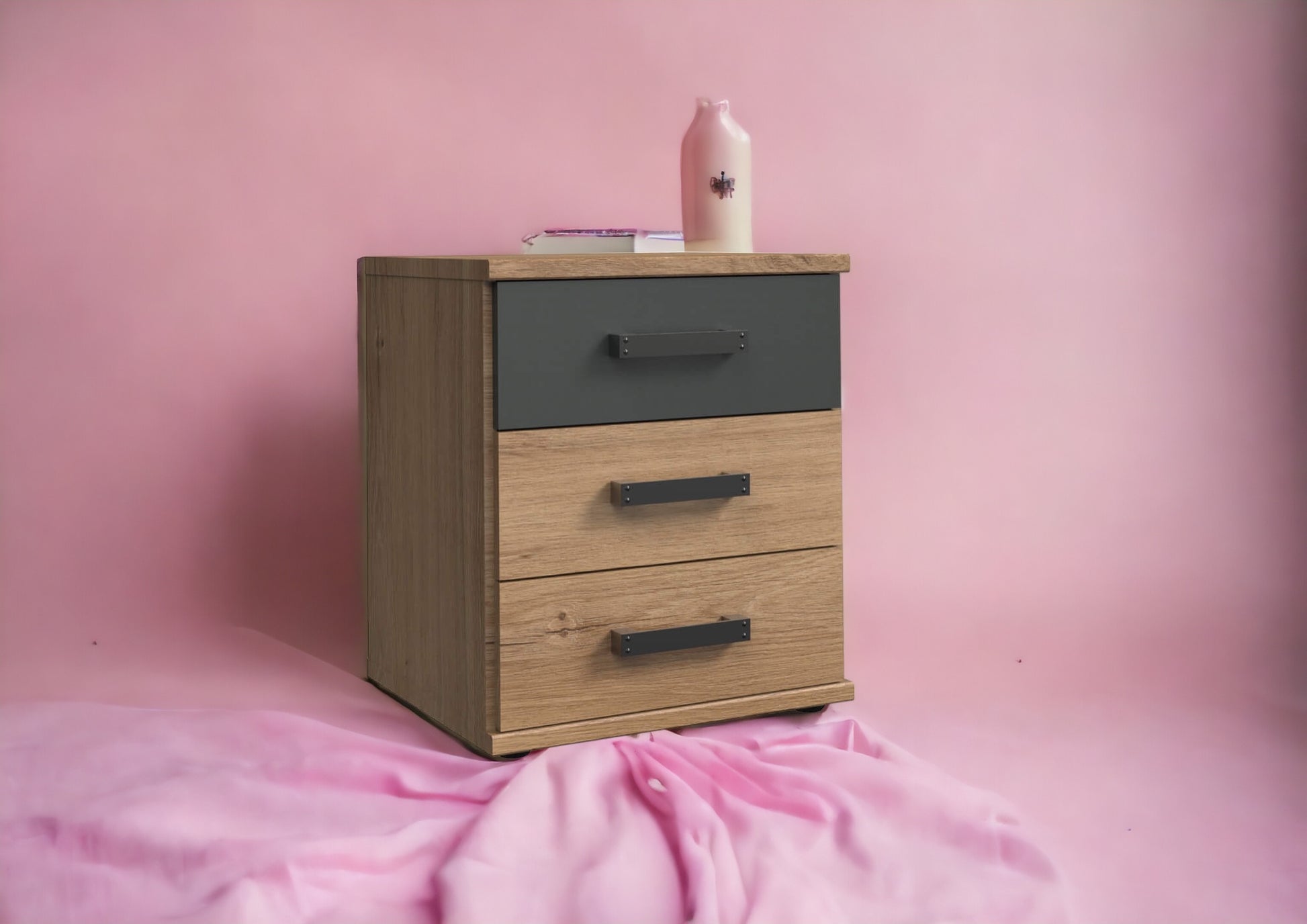Mit 3 Schubladen. Dekor: Plankeneiche-Nachbildung, Abs. Graphit.
