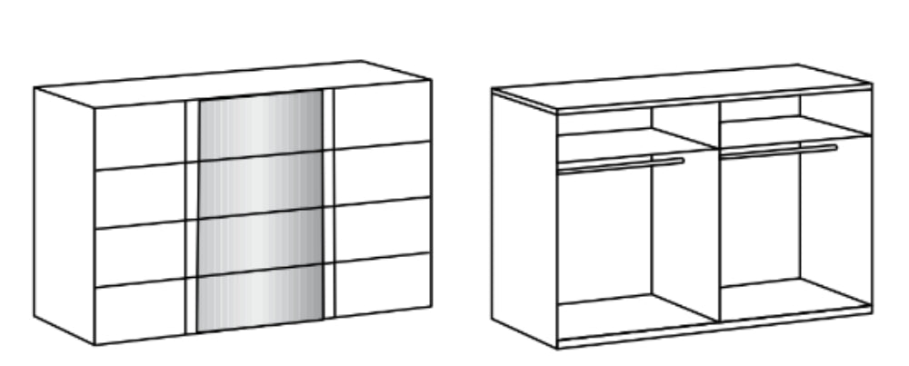 Schwebetürenschrank 3-türig mit 2 Abteilungen inkl. Seiten ca: 112,5/112,5 cm, inkl. 2 Einlegeböden und 2 Kleiderstangen. Dekor: Korpus und Front Weiß, Abs. Raw Steel, mittlere Tür mit Spiegel.