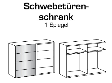 Schwebetürenschrank 2-türig besteht aus 2 Abteilungen inkl. Seiten ca.: 90/90 cm, inkl. 2 Einlegeböden + 2 Kleiderstangen. Front und Korpus Weiß.