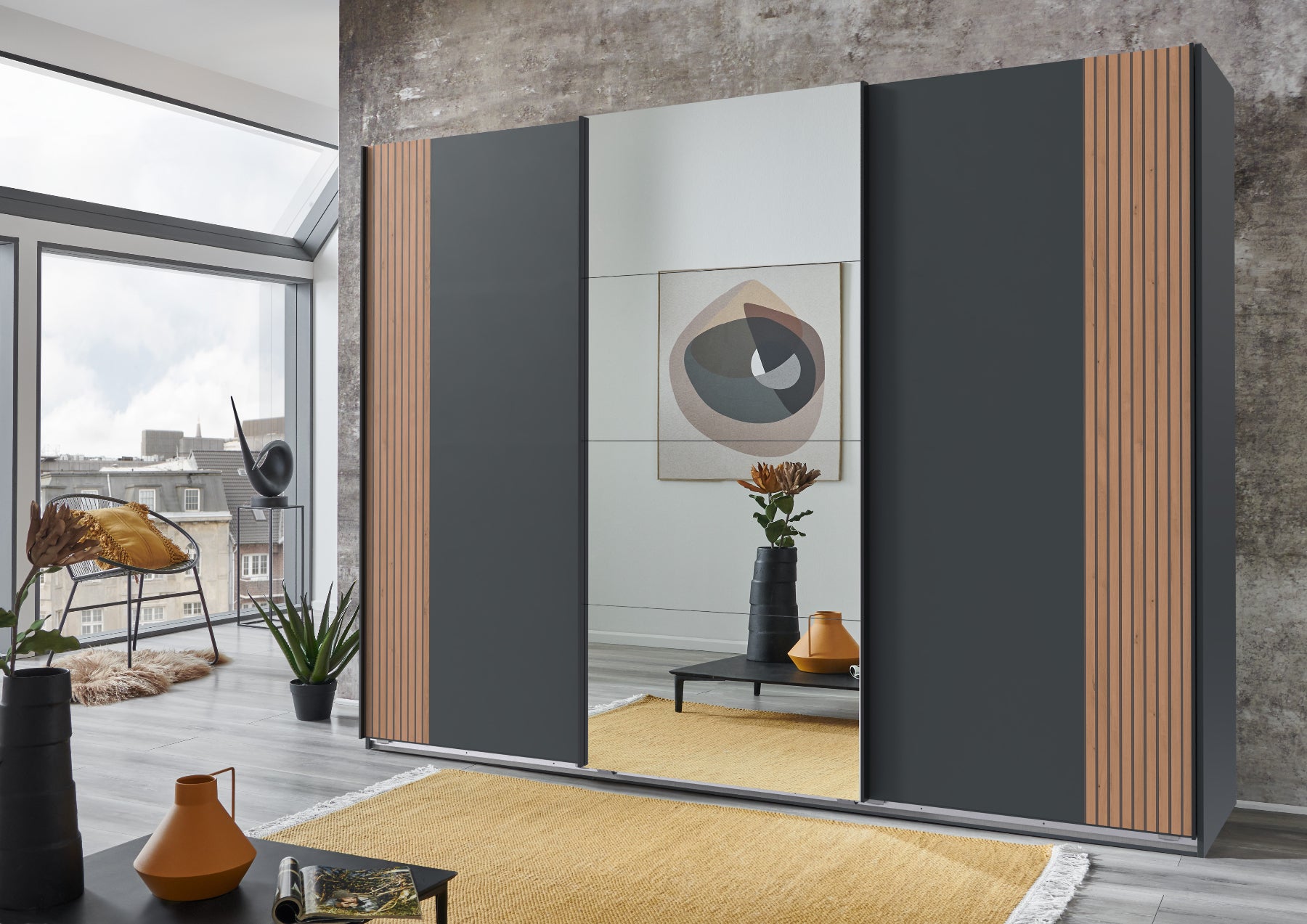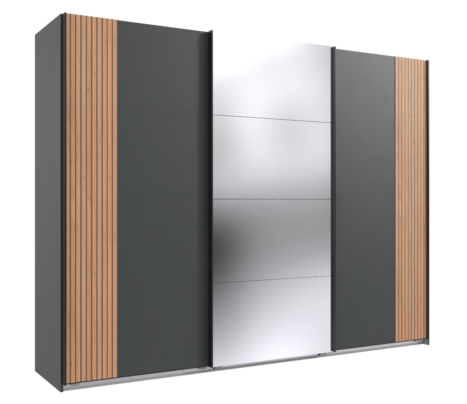 Absetzung nach innen, 3 Abteilungen inkl. Seiten ca: 90/90/90 cm, inkl. 3 Einlegeböden und 3 Kleiderstangen, Front und Korpus Graphit, Absetzung Akustiklamellen-Nachbildung in Artisan-Eiche-Nachbildung, mittlere Tür Spiegelglas.