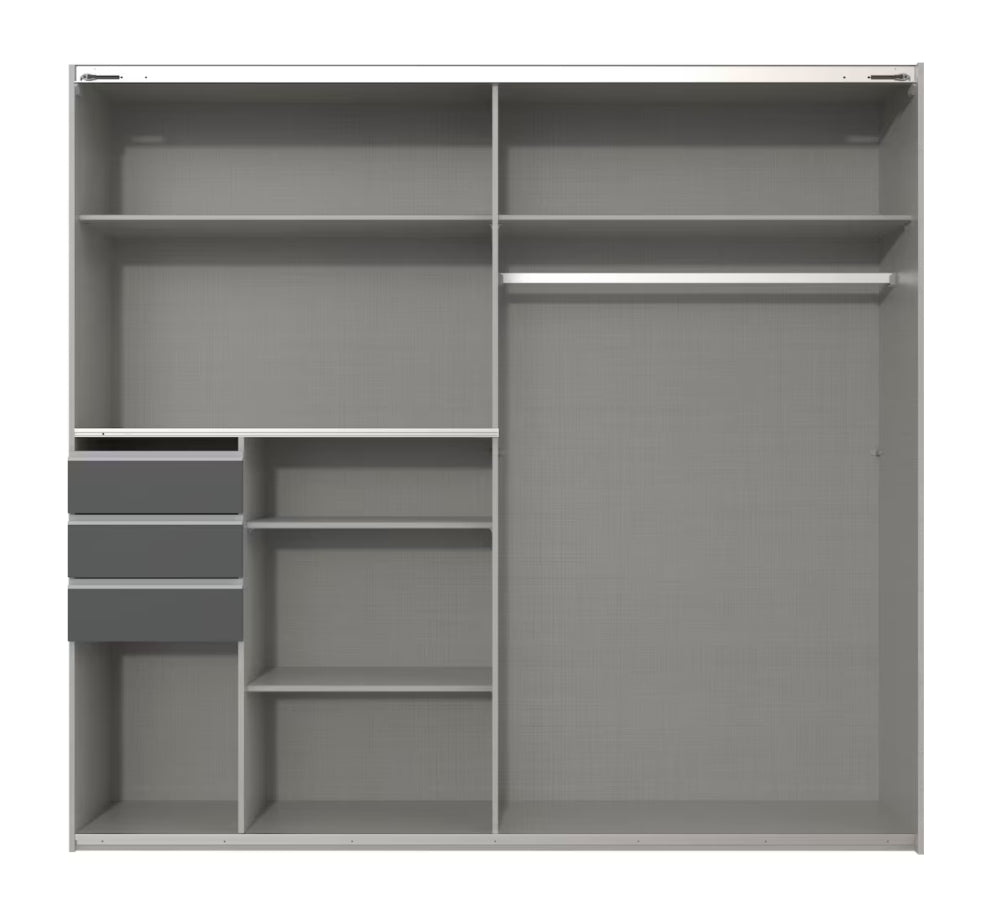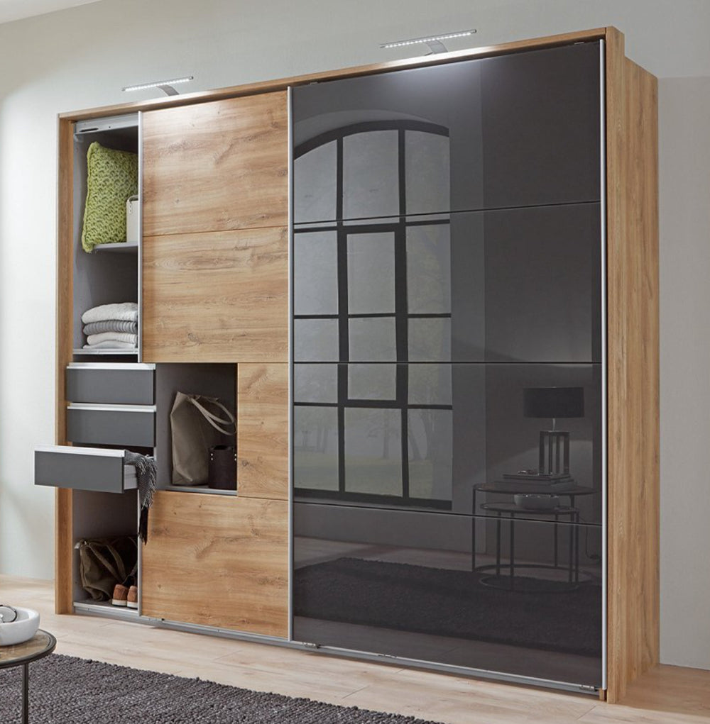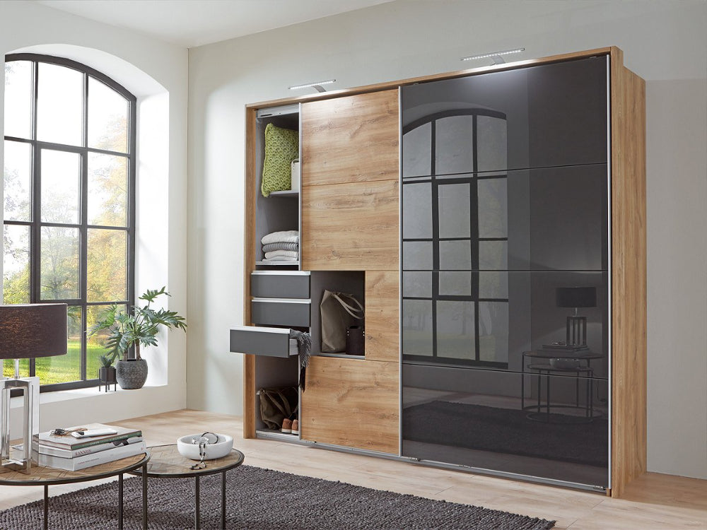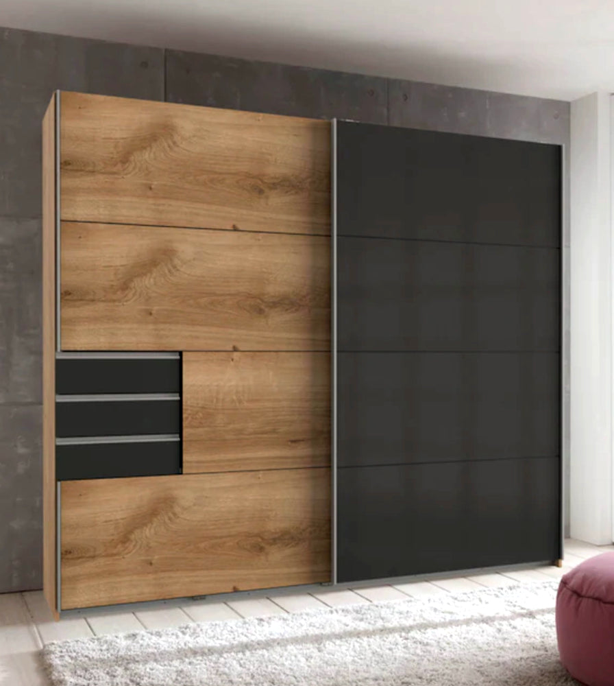 Schwebetürenschrank 2-türig mit 2 Abteilungen inkl. Seiten ca.: 112,5/112,5 cm, inkl. 3 Einlegeböden + 1 Kleiderstange. Dekor: Türfront mit 3 Schubkästen Plankeneiche-Nachbildung, durchgängige Türfront Glas Grey, Schubkästen Graphit.