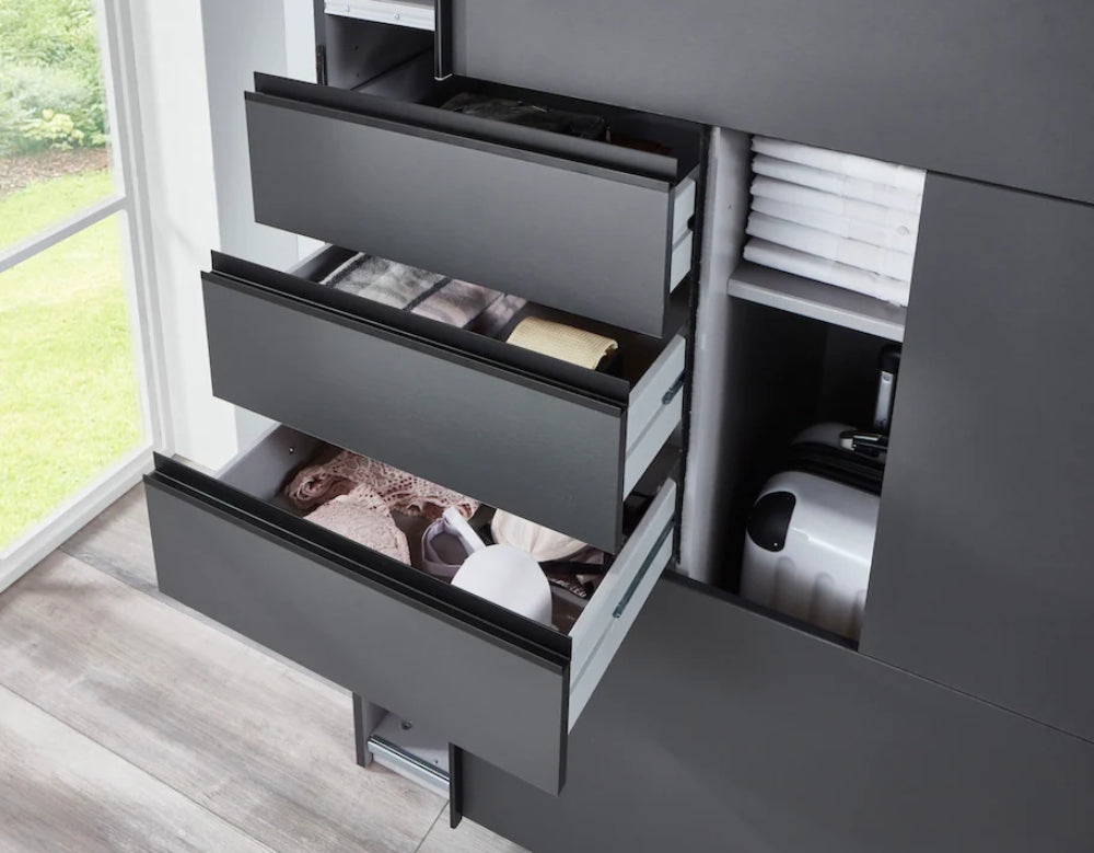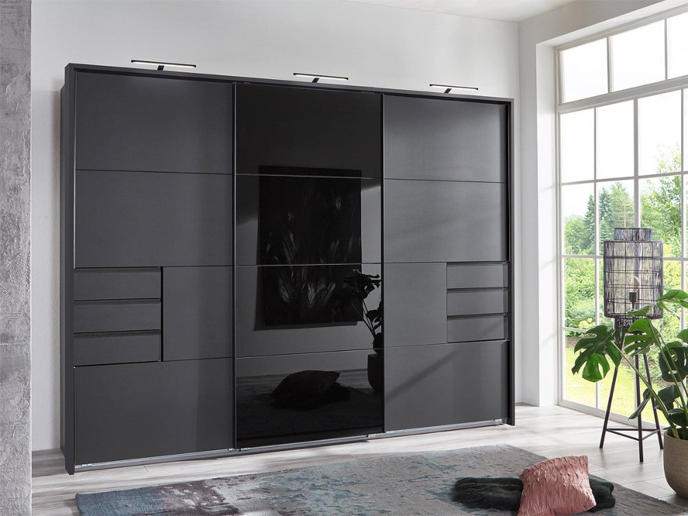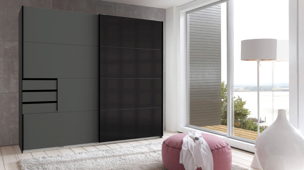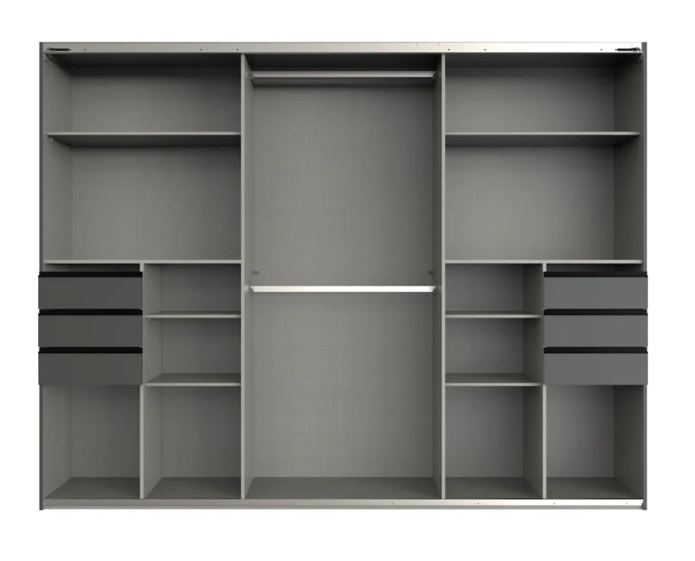 Schwebetürenschrank 2-türig mit 2 Abteilungen inkl. Seiten ca.: 112,5/112,5 cm, inkl. 3 Einlegeböden + 1 Kleiderstange. Dekor: Türfront mit 3 Schubkästen Plankeneiche-Nachbildung, durchgängige Türfront Glas Grey, Schubkästen Graphit.