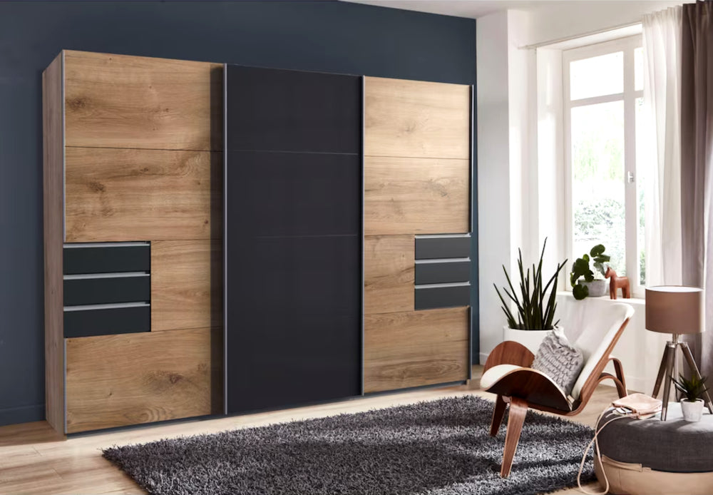 Er ist in zwei stilvollen Farben erhältlich: Plankeneiche und elegantes Graphit, perfekt für jedes Wohnambiente. Der Schrank ist in Varianten mit zwei oder drei Türen verfügbar, sodass Sie genau das Modell wählen können, das Ihren Bedürfnissen entspricht. Dank der schwebenden Türen sparen Sie Platz und verleihen dem Raum eine moderne Optik.