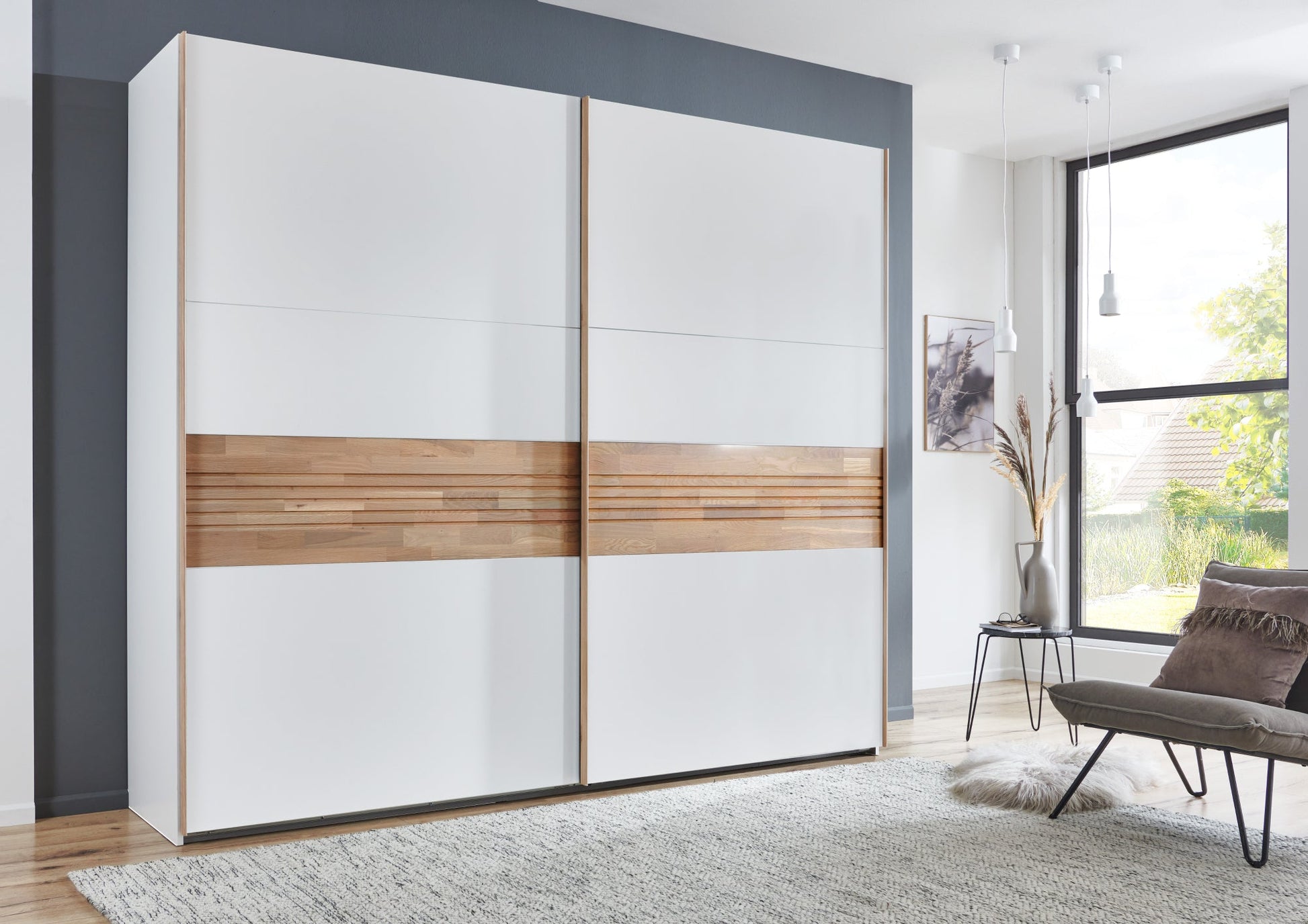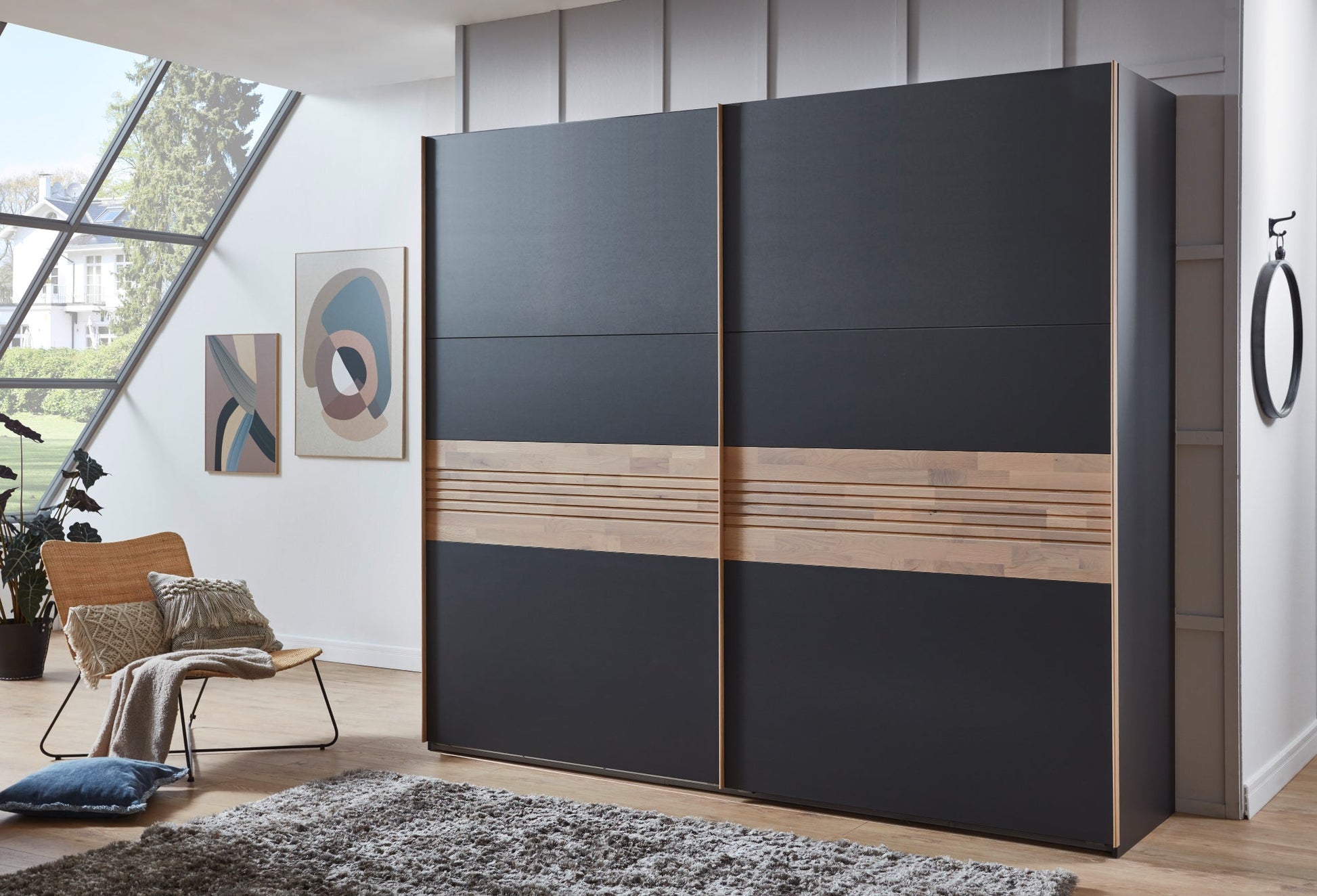 Dieser Schwebetürenschrank von Wimex vereint Praktikabilität und Stil mit Eleganz. Mit seinen Schwebetüren schafft er eine ruhige Atmosphäre, während die Massivholz-Eichenabsetzung das Design aufwertet. Erhältlich in Weiß oder Graphit, ist er das perfekte Möbelstück für Ihr luxuriöses Zuhause. B/H/T 200 x 216 x 65 cm.