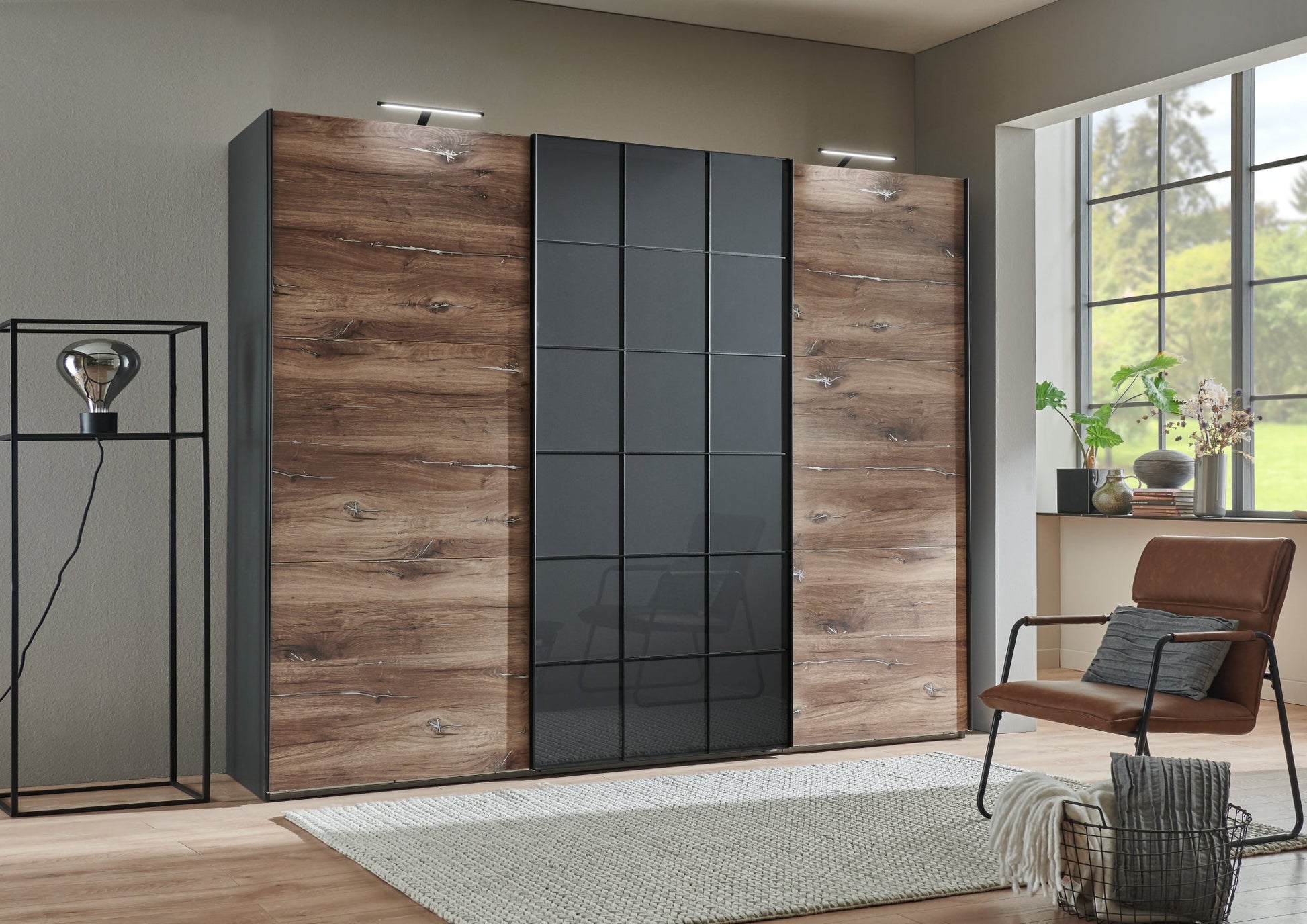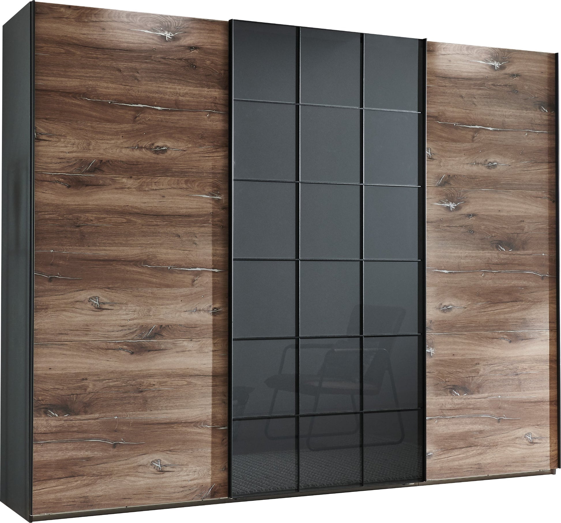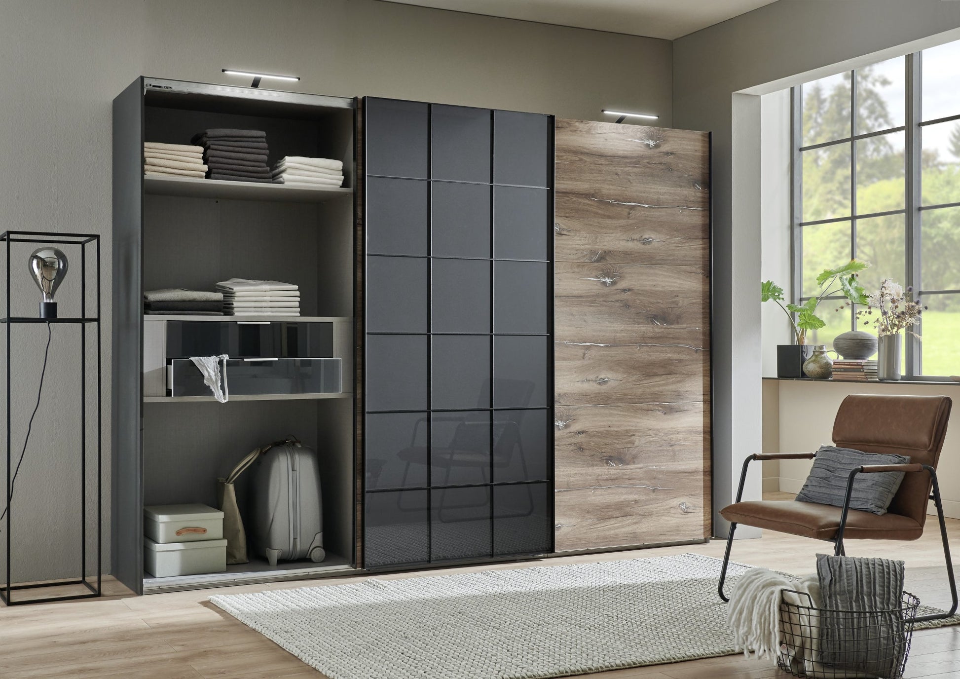 3 Abteilungen inkl. Seiten ca. 100/100/100 cm, inkl. 3 Einlegeböden + 3 Kleiderstangen. Dekor: Front Flagstaff Eiche Nachbildung + Glas Grey, Korpus Graphit, Griffe Schwarz.