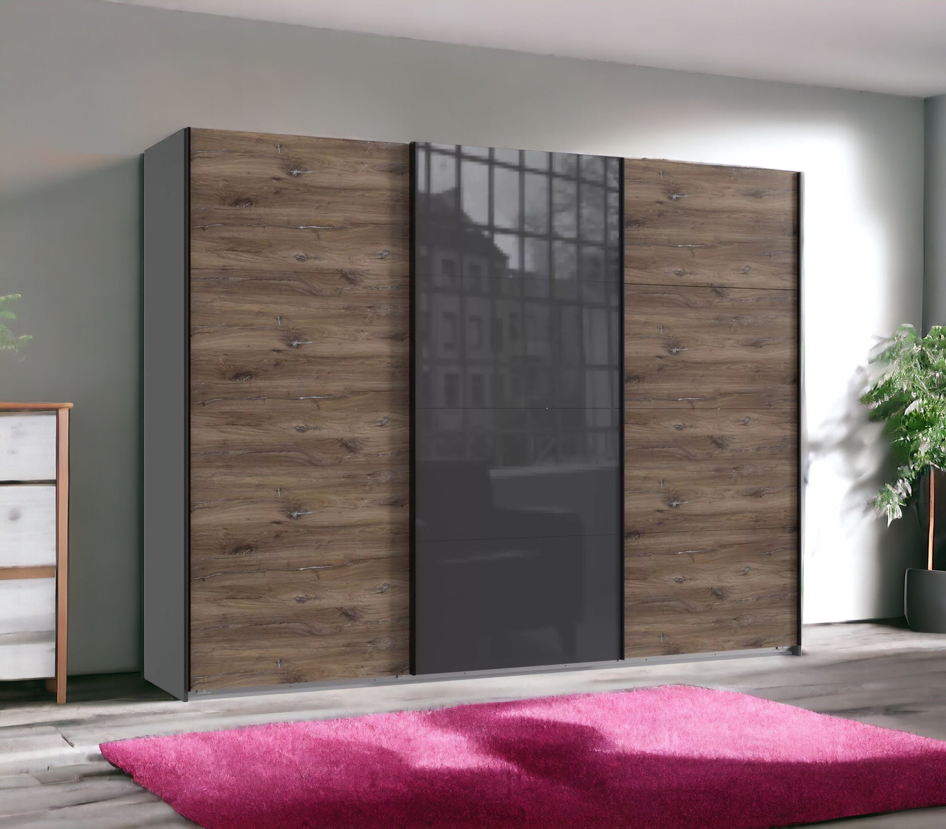 Ohne Passepartout-Rahmen. 3 Abteilungen inkl. Seiten ca. 90/90/90 cm, inkl. 3 Einlegeböden + 3 Kleiderstangen. Dekor: Plankeneiche-Nachbildung, Abs. Graphit + Glas Grey, Griffe Schwarz.