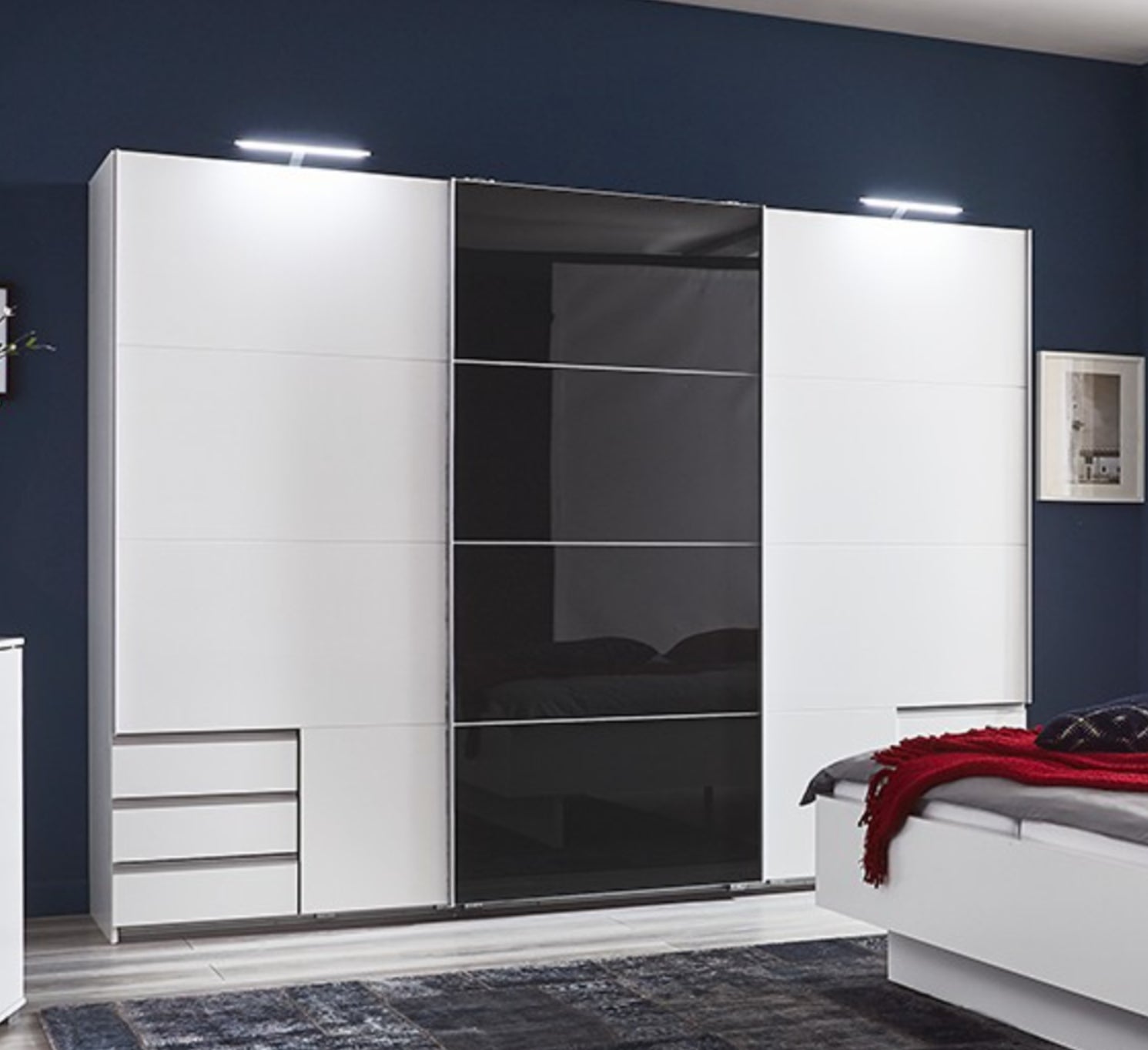 Schwebetürenschrank Valencia 3-türig mit Glastür und 6 Schubladen B/H/T ca. 270 x 208 x 65 cm