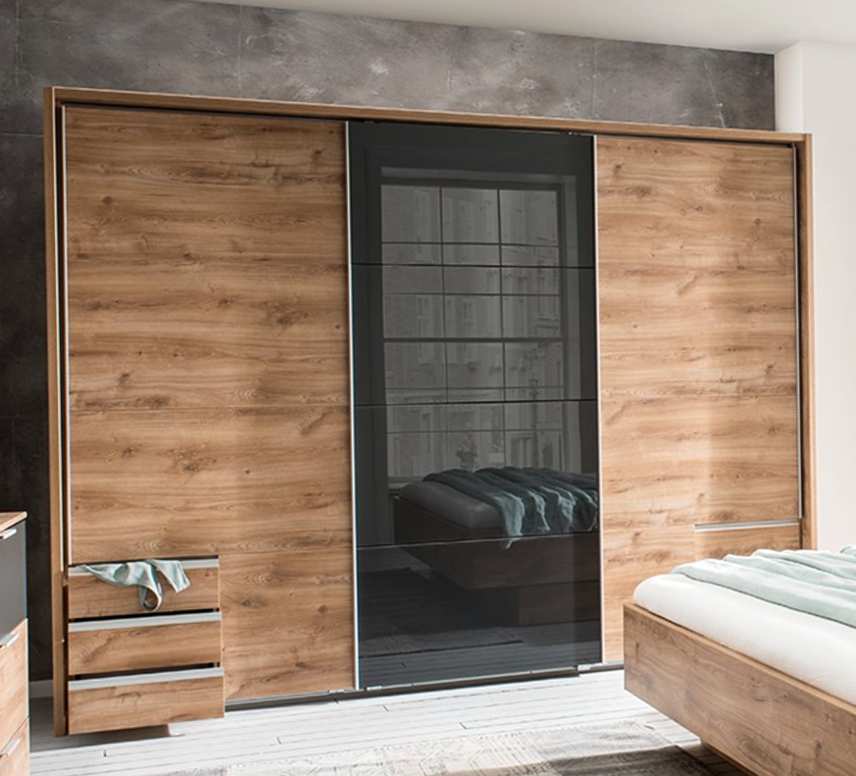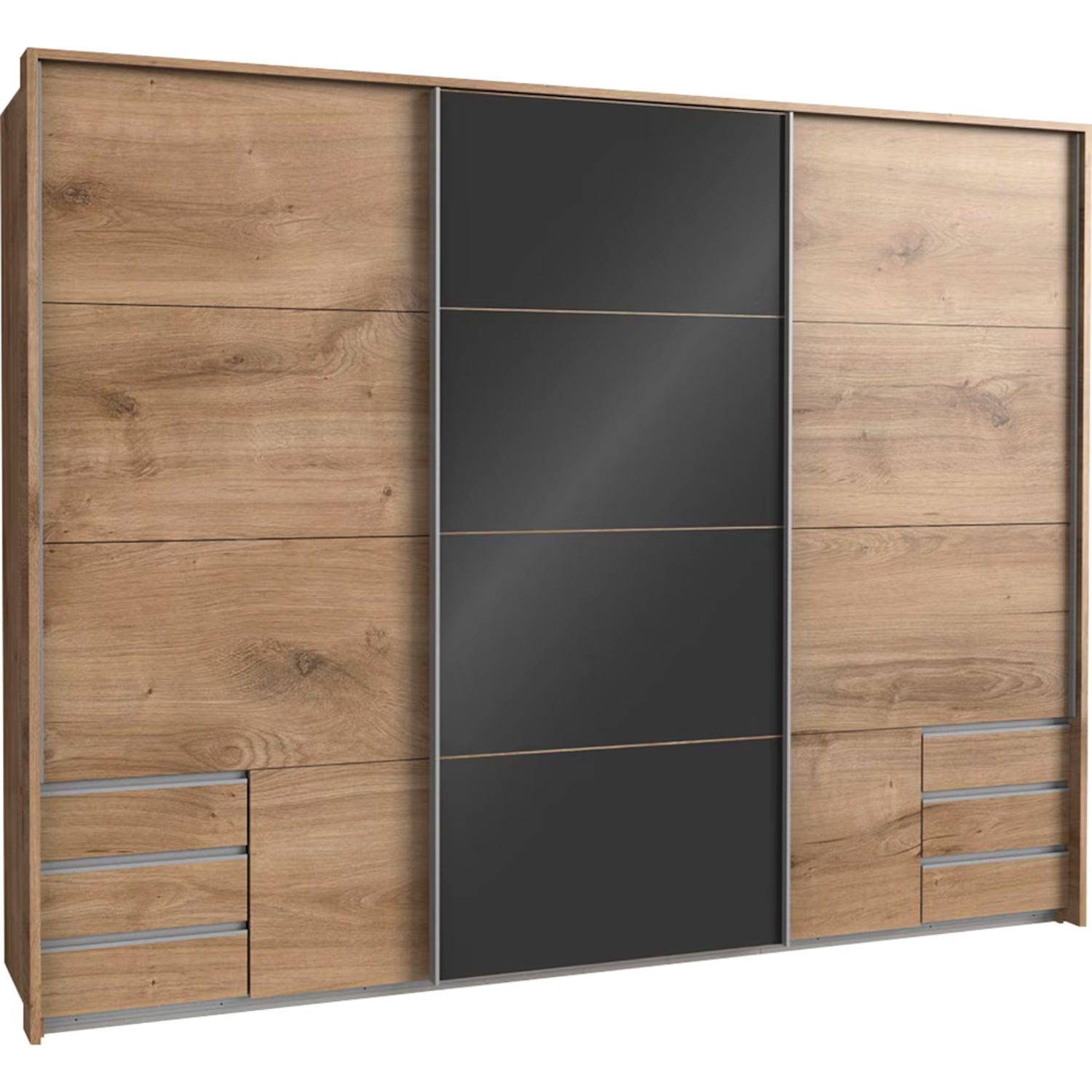 Ohne Passepartout-Rahmen. 3 Abteilungen inkl. Seiten ca. 90/90/90 cm, inkl. 3 Einlegeböden + 3 Kleiderstangen, inkl. 6 Schubladen. Dekor: Plankeneiche-Nachbildung, Abs. Graphit + Glas Grey, Griffe Schwarz.