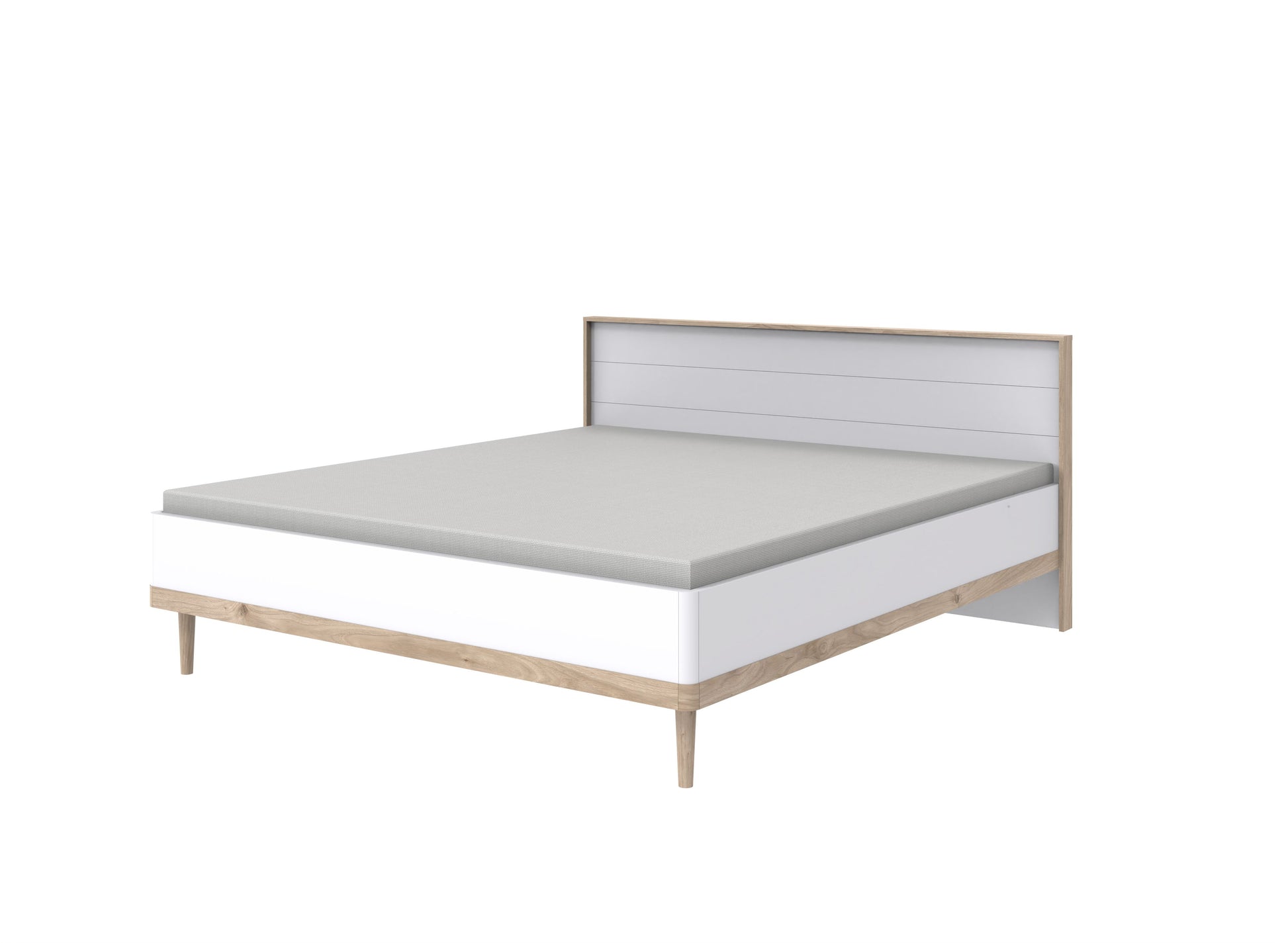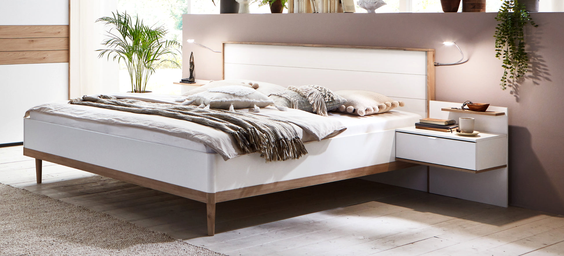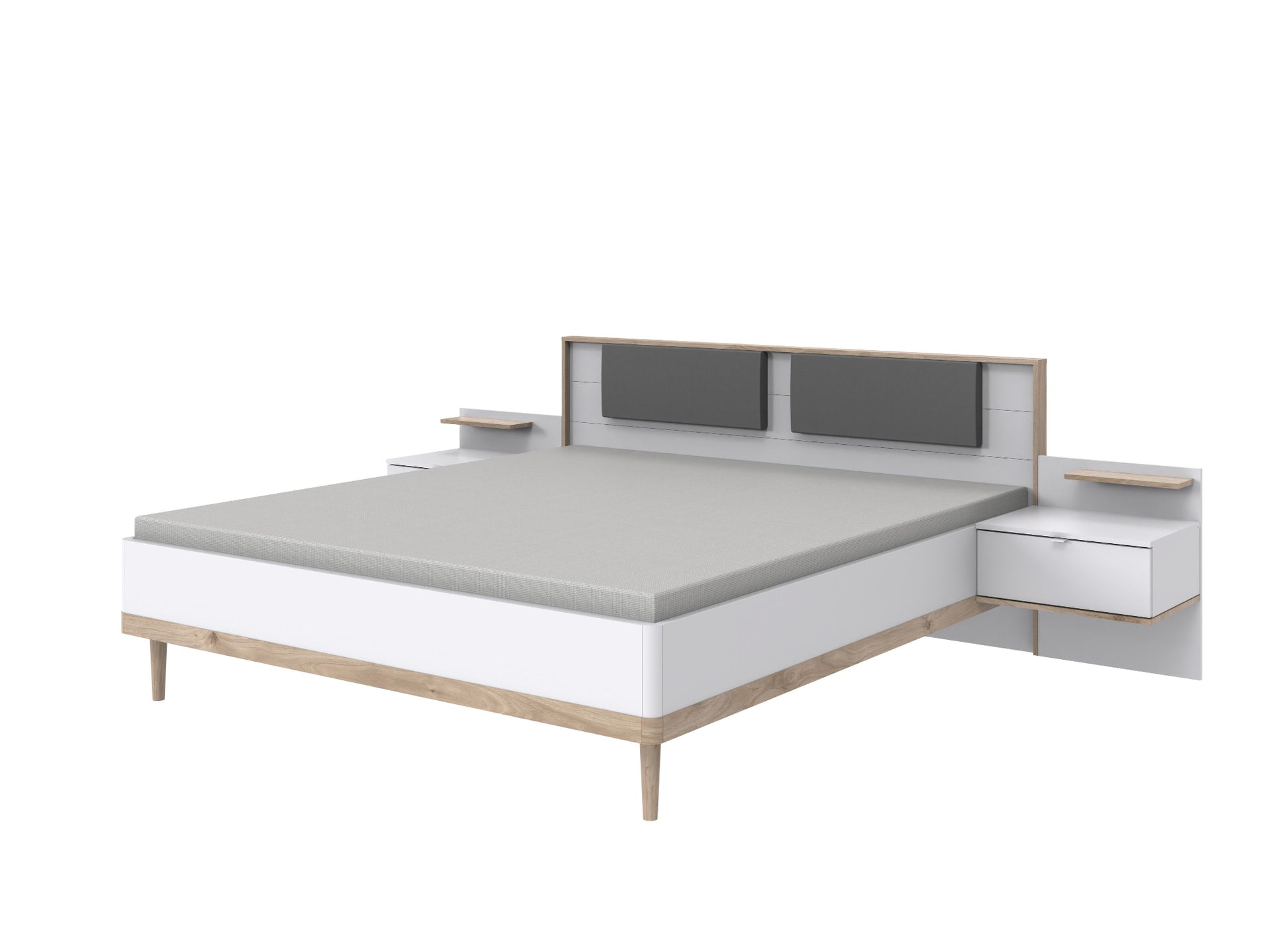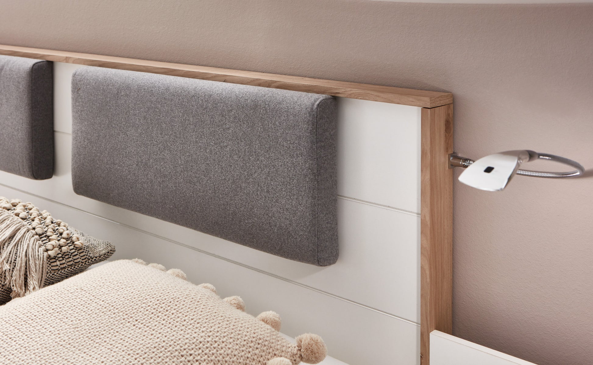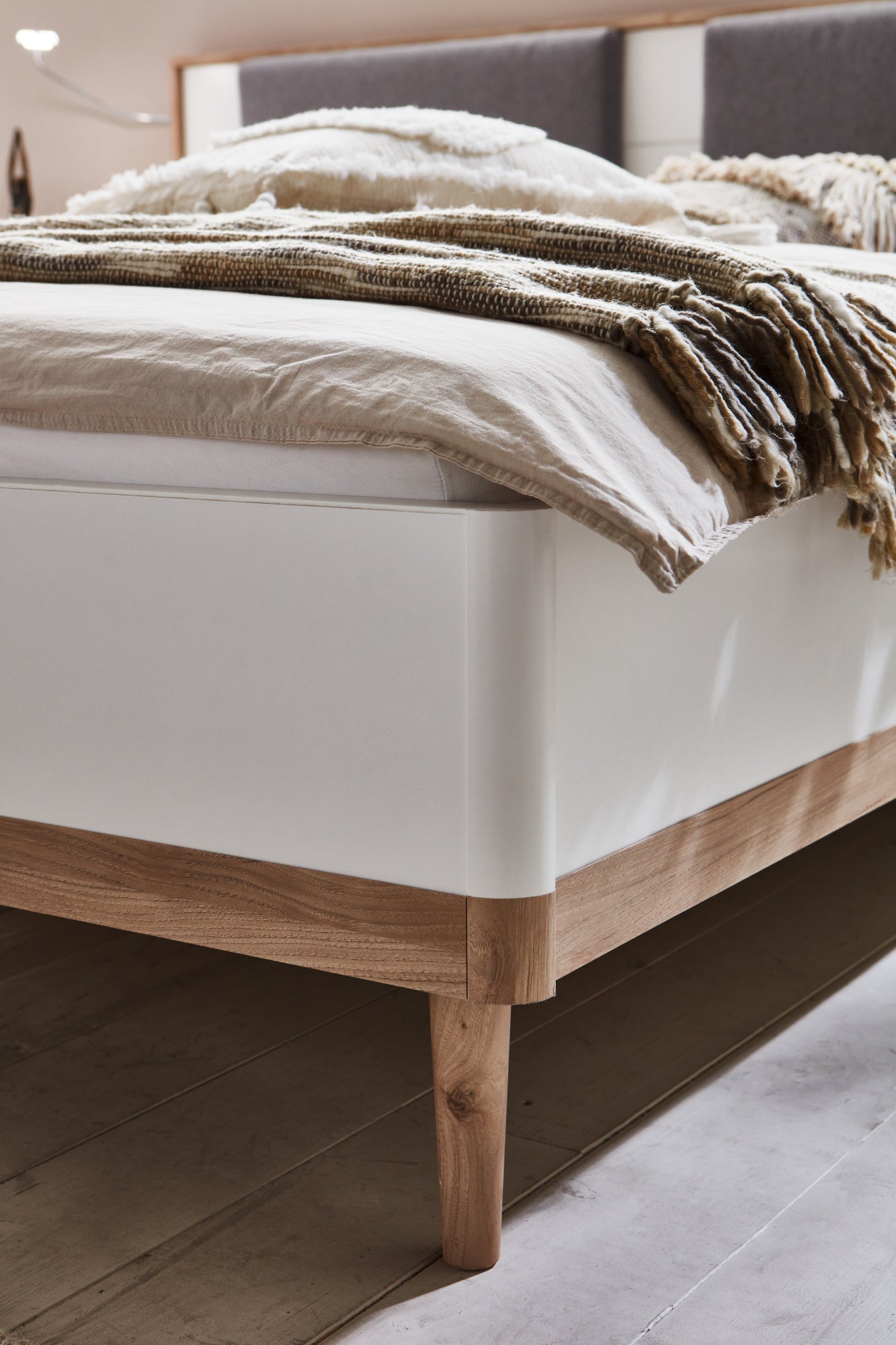 Ohne Polster und Nachtschränke, höhenverstellbar. Dekor: Weiß, Abs. Hickroy-Oak Nachbildung. Ohne Deko, Lattenroste und Matratzen.