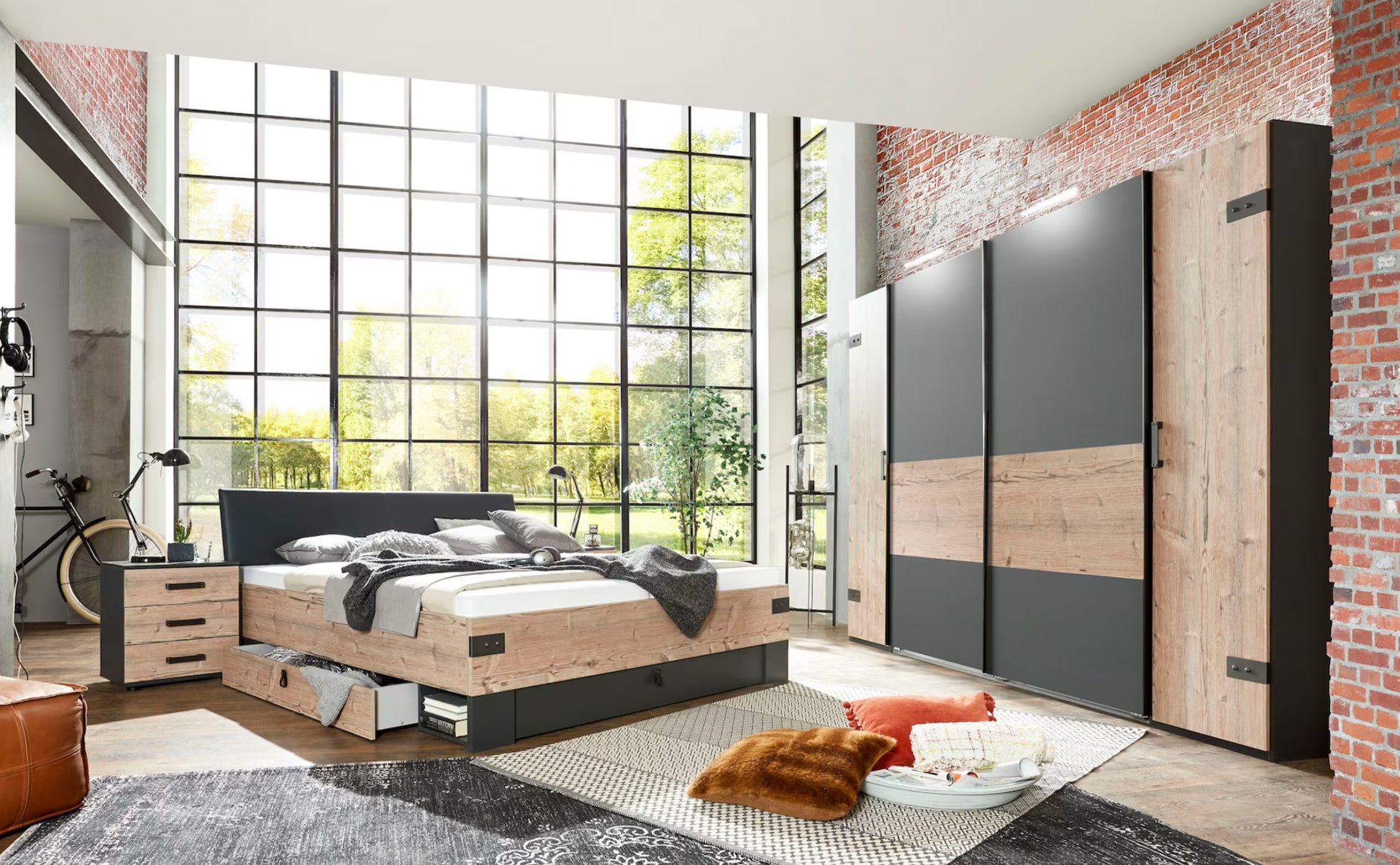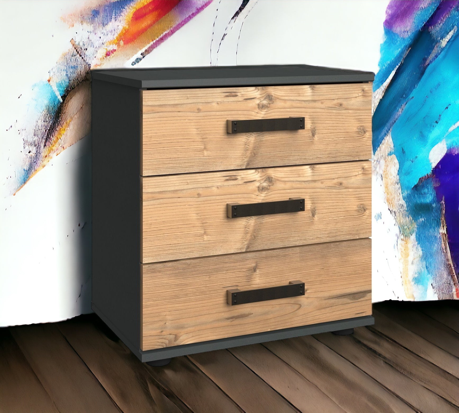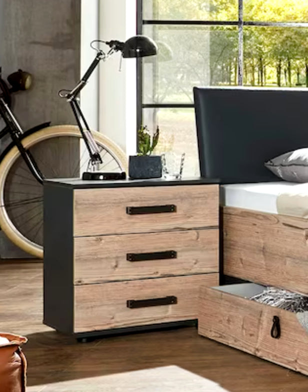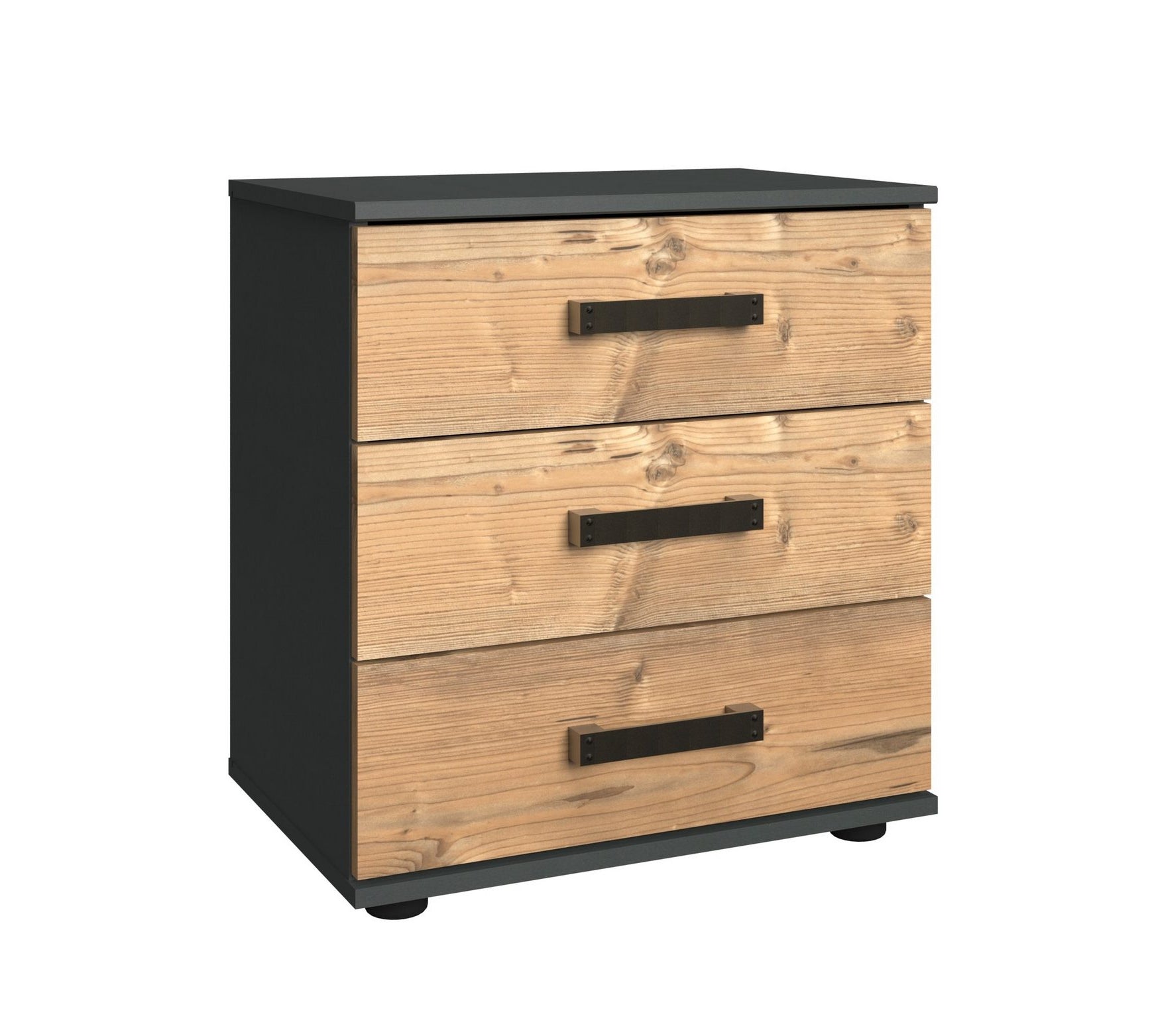 3 Schubladen. Korpus Graphit, Plankeneiche Nachbildung.