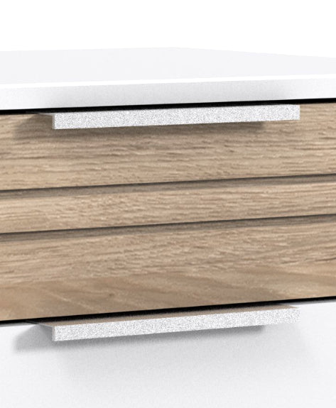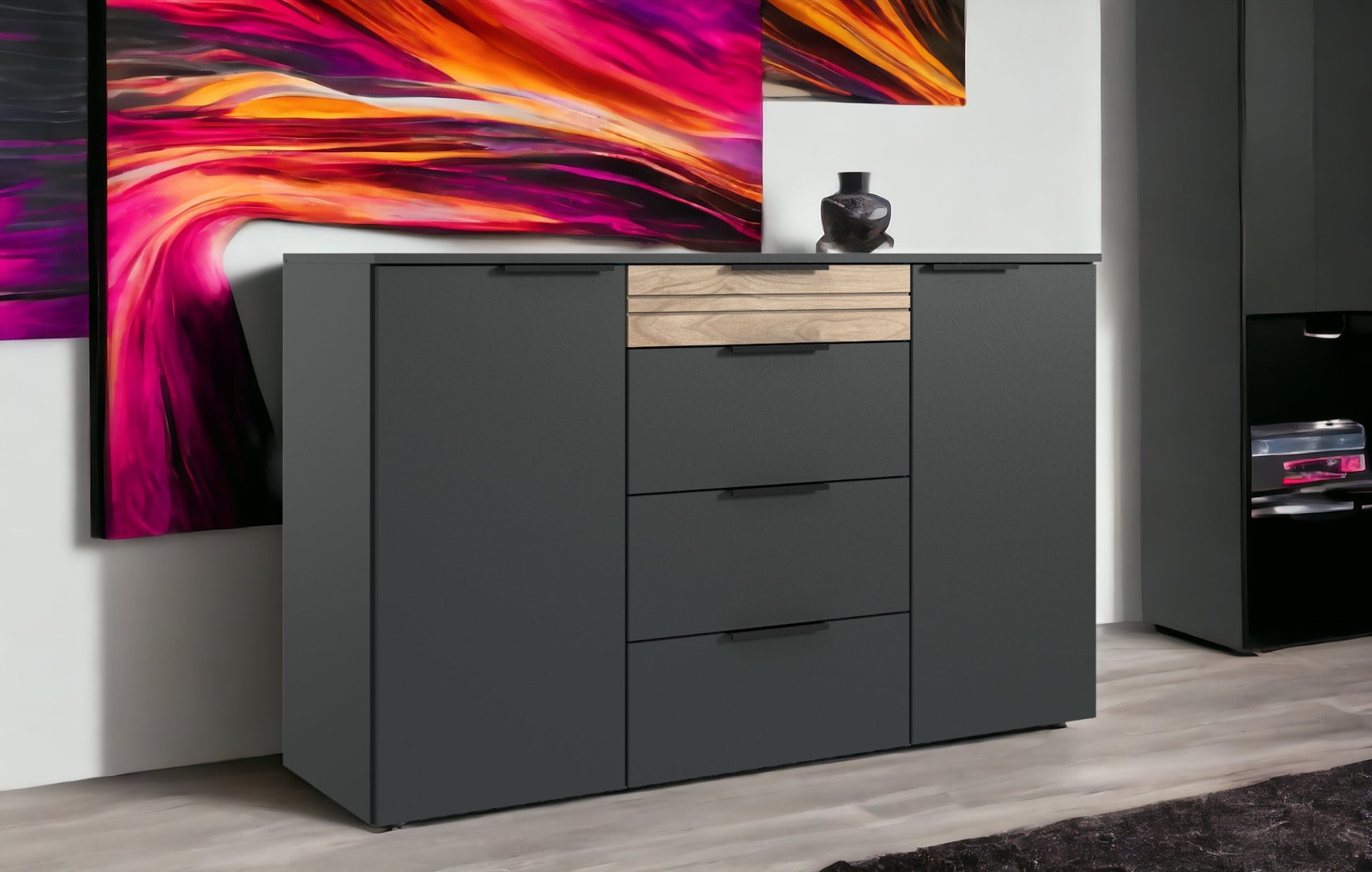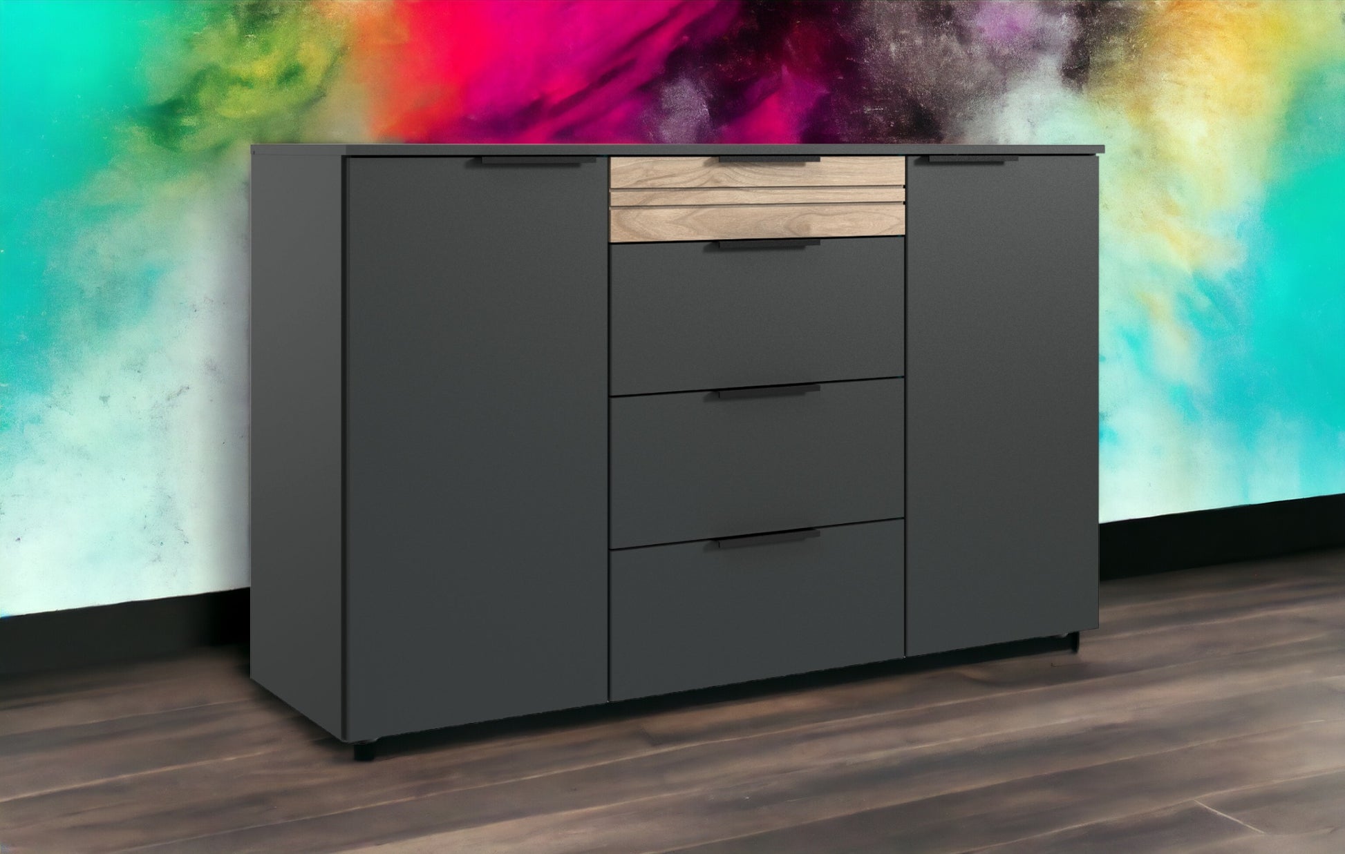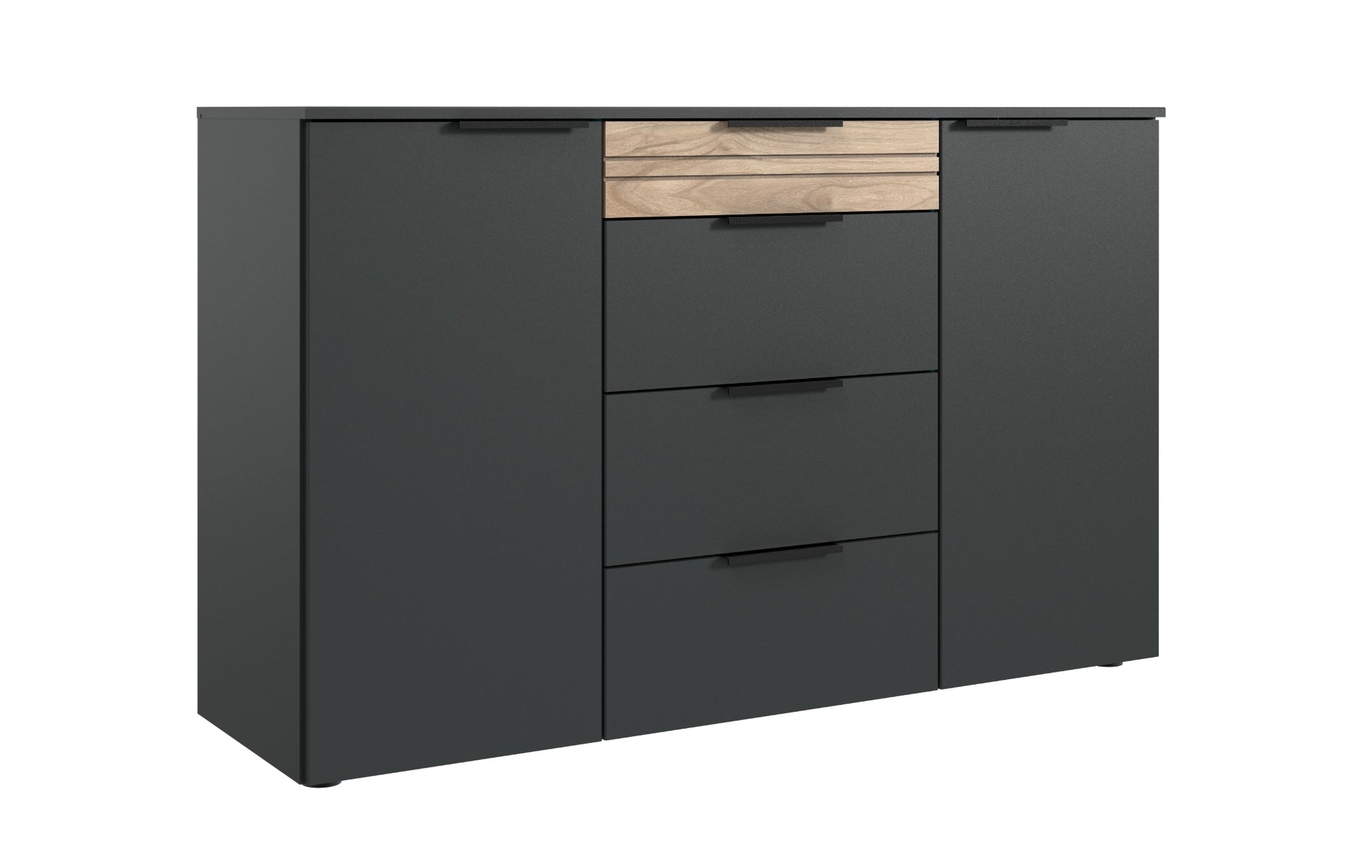 Tür links und rechts, in der Mitte 4 Schubladen. Dekor: Front und Korpus Graphit, Absetzung Massivholz Eiche-farbig.