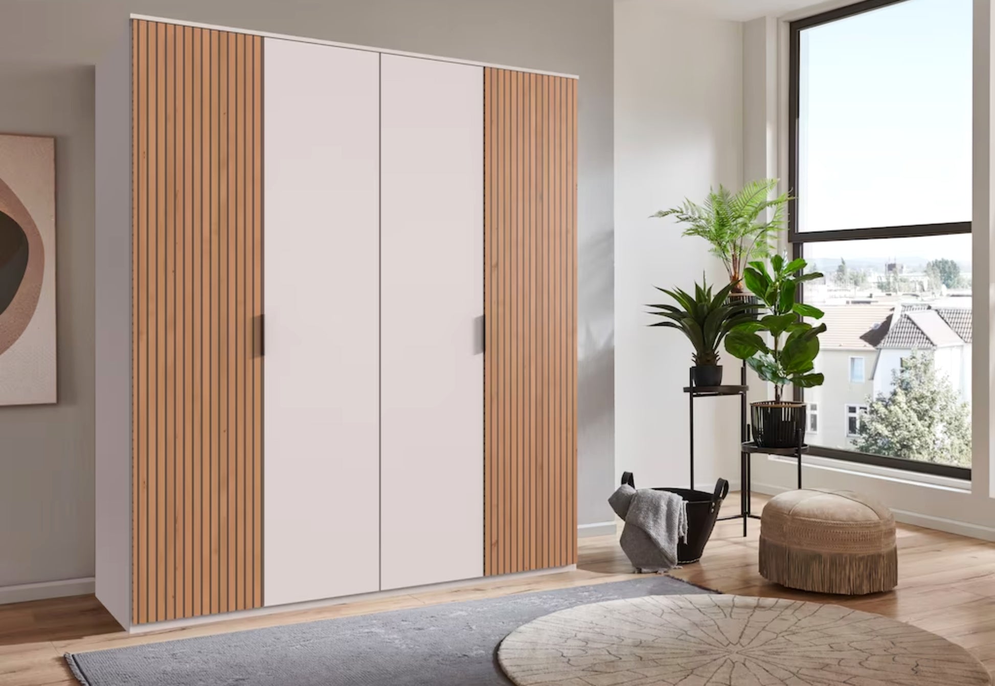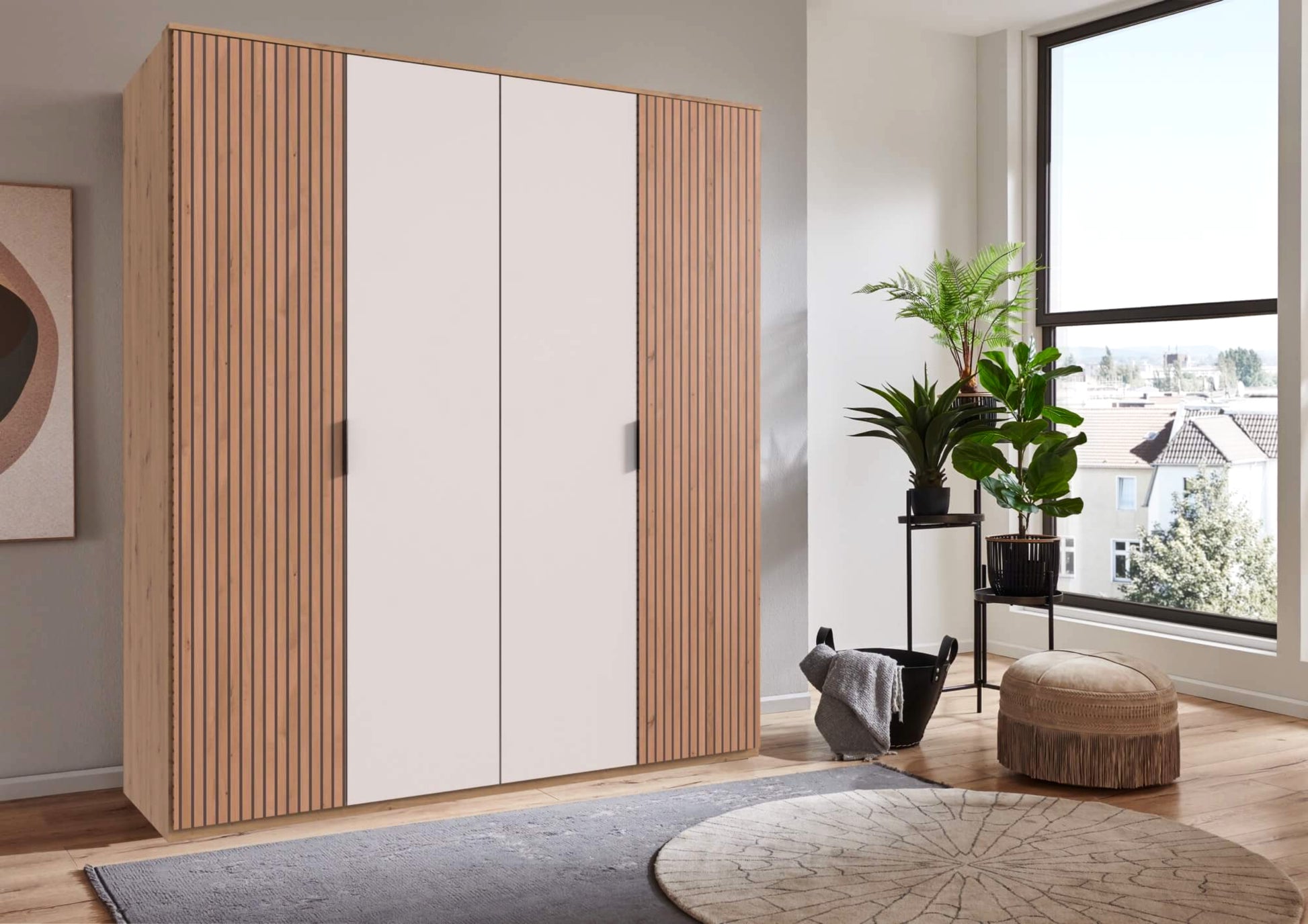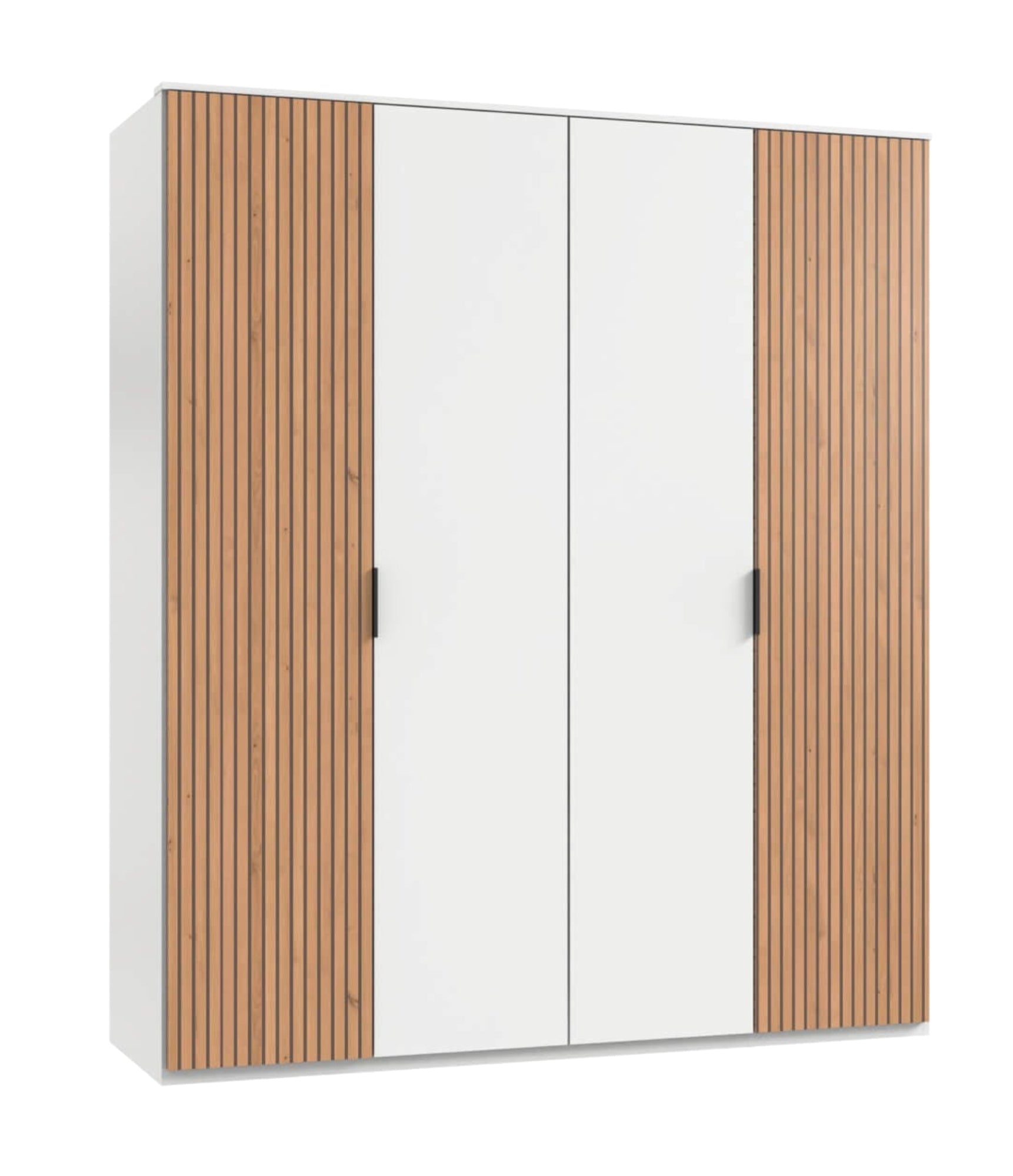 2 Abteilungen inkl. Seiten ca. 90/90 cm, inkl. 2 Einlegeböden + 2 Kleiderstangen. Dekor: Front + Korpus Weiß, Abs. Akustiklamellen Nachbildung Artisan Eiche Nachbildung.