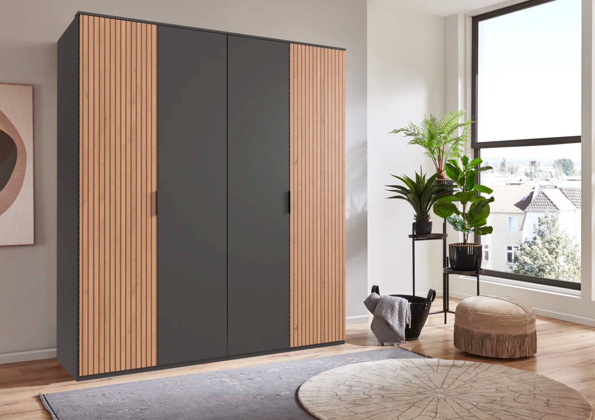 Der Wimex Drehtürenschrank Tunis bietet Ihnen modernen Stil und Kompaktheit in einem. Mit einer Gesamtgröße von B/H/T 180 x 210 x 58 cm und einer Farbkombination aus Weiß, Graphit und Artisan-Eiche, ist er perfekt für jedes Schlafzimmer. Die Aussentüren mit Absetzung in Akustiklamellen-Nachbildung sorgen für eine zusätzliche ästhetische Note.