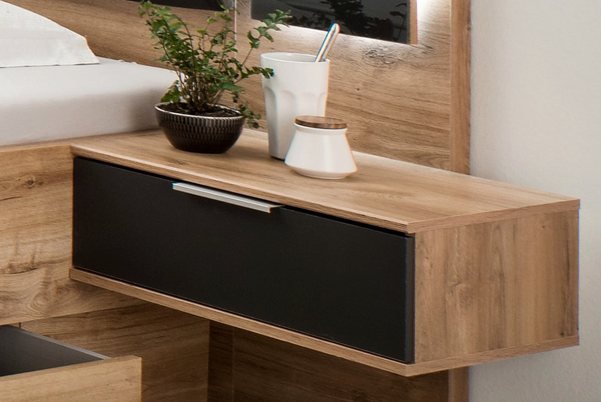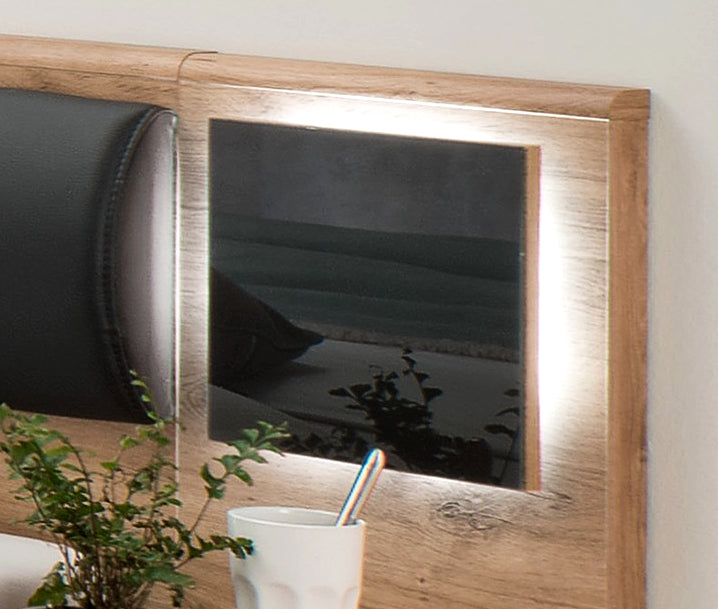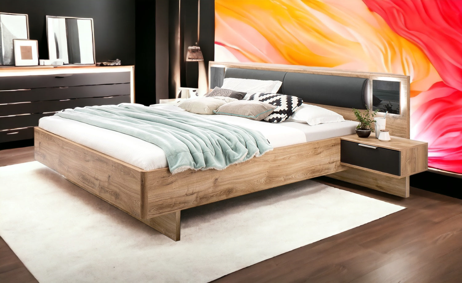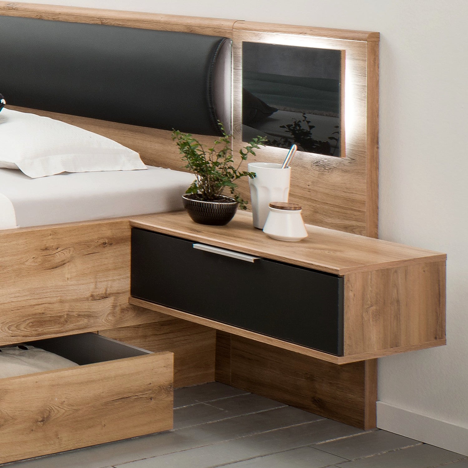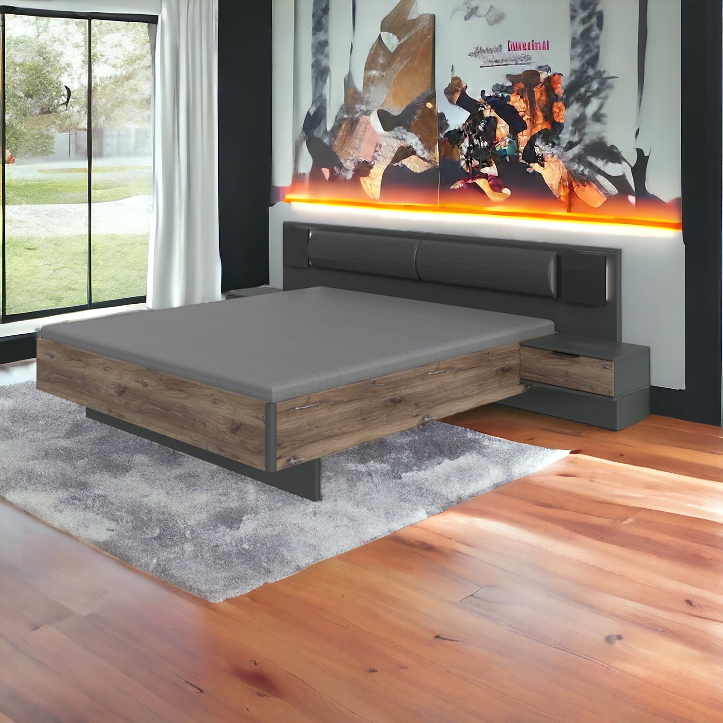 Bett 160 x 200. Inkl. LED-Beleuchtung Energieklasse F, 45 Lumen, inkl. Nachtschränke. Dekor: Plankeneiche Nachbildung, Bettpolster Kunstleder Graphit, Abs. Graphit. Ohne Deko, Lattenroste und Matratzen.