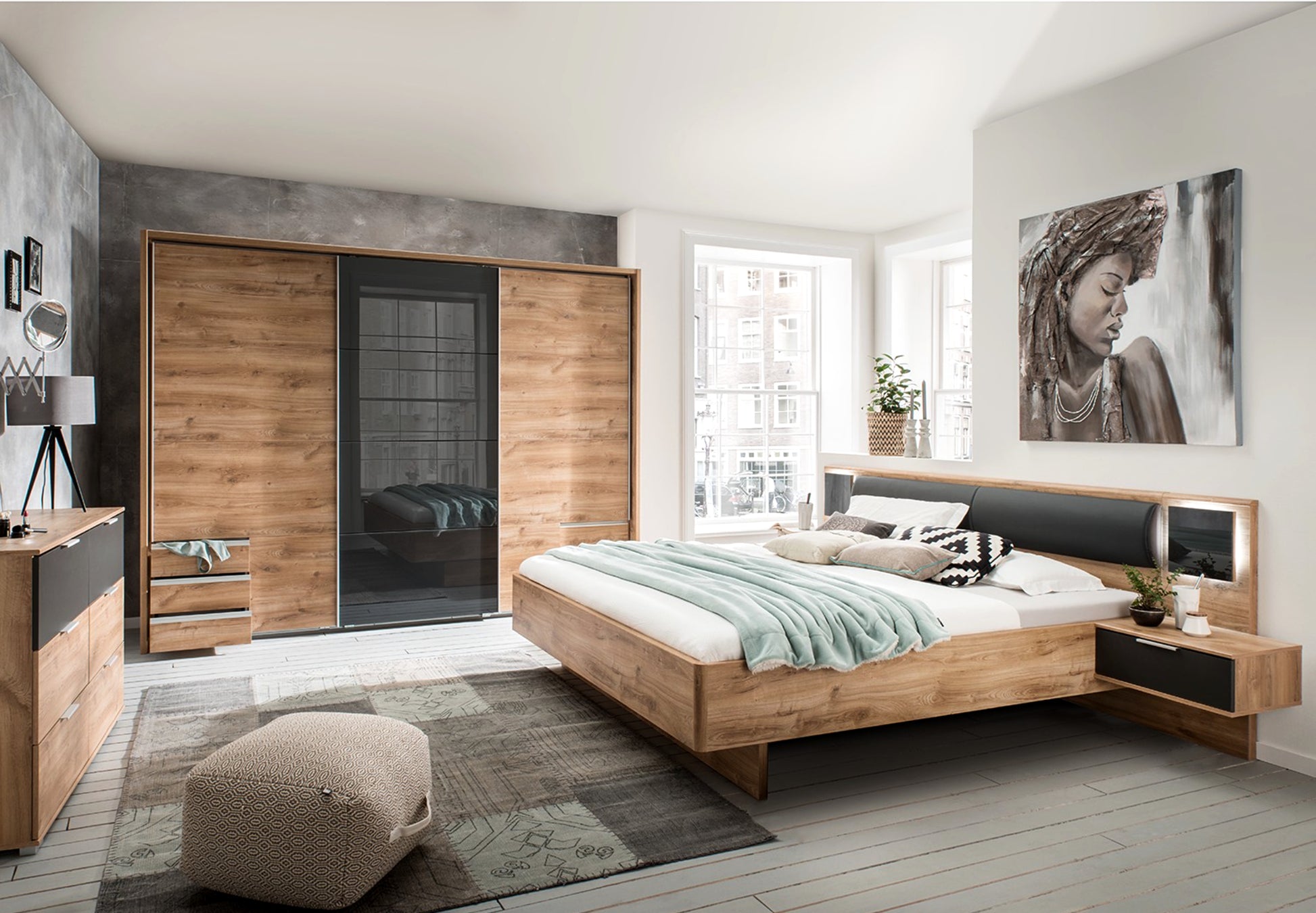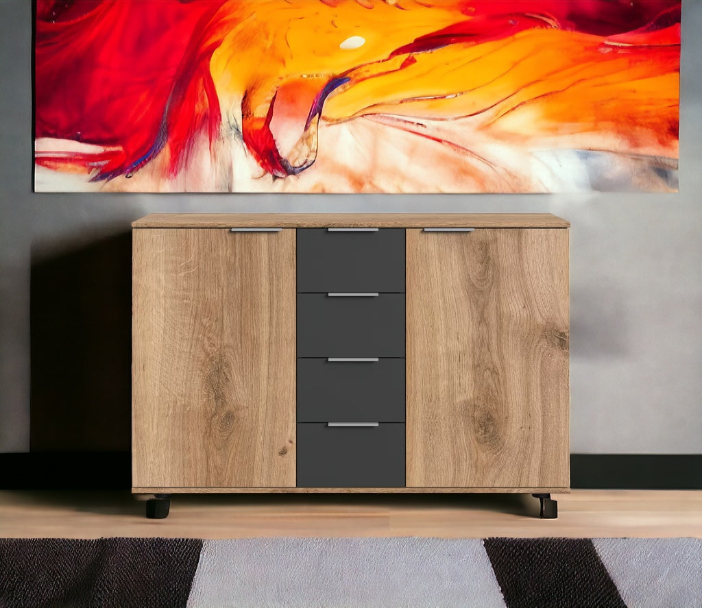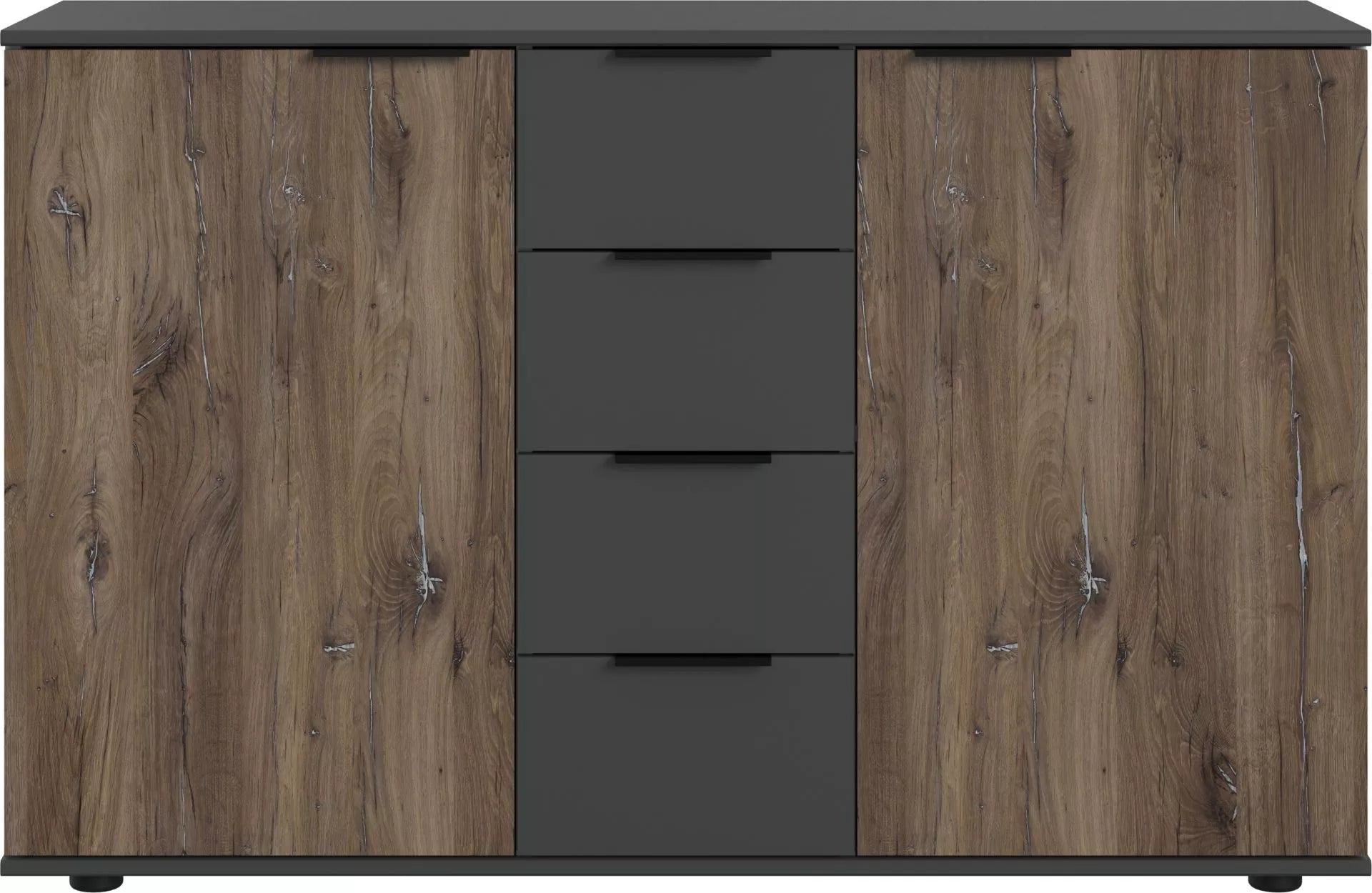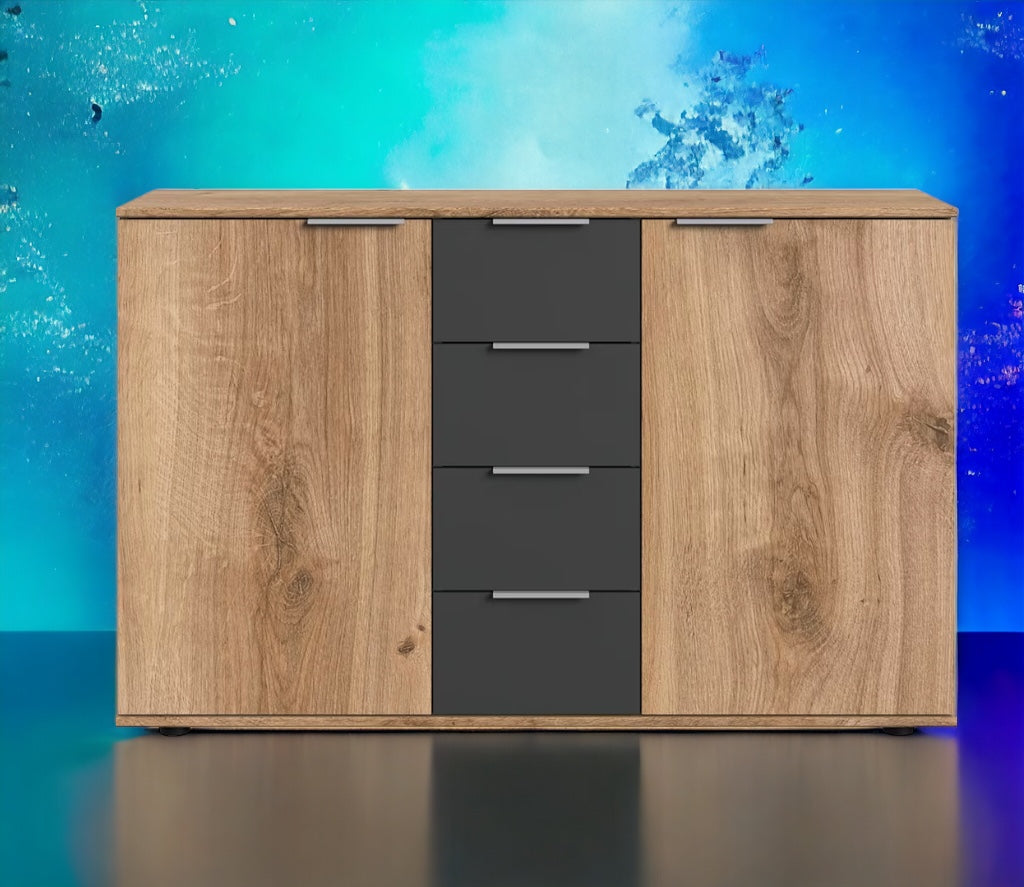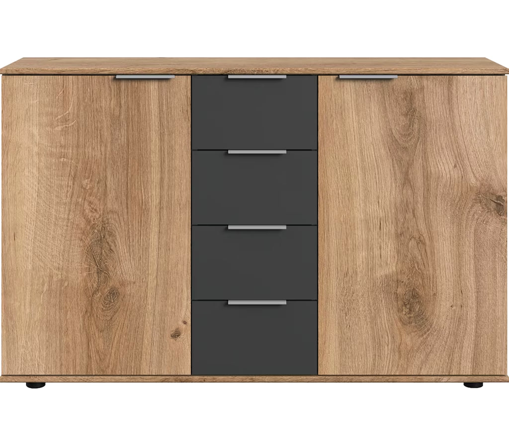 Tür links und rechts, in der Mitte 4 Schubladen, Inkl. 2 Einlegeböden. Dekor: Plankeneiche-Nachbildung, Abs. Graphit.