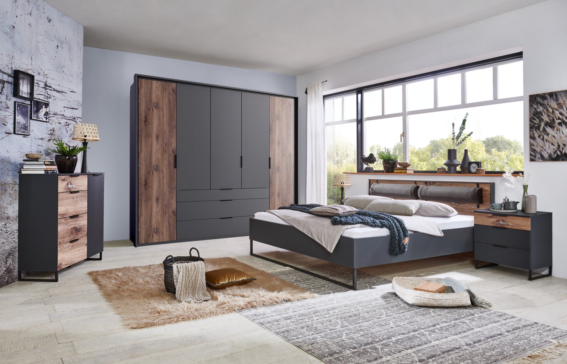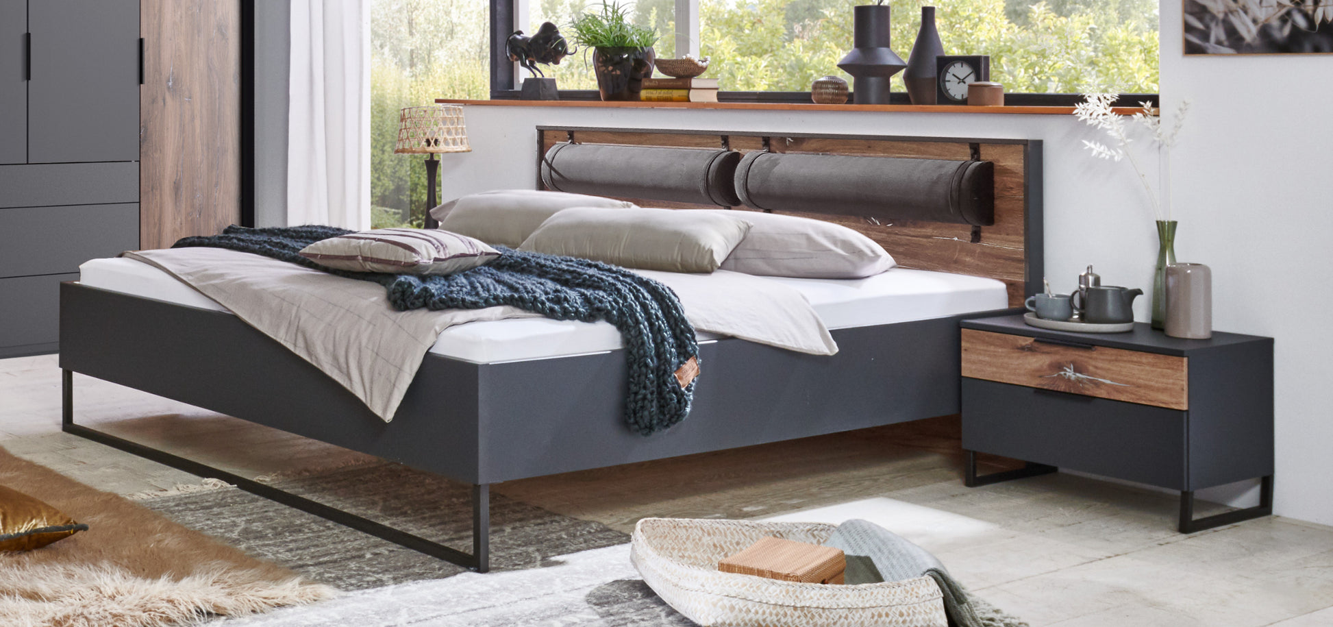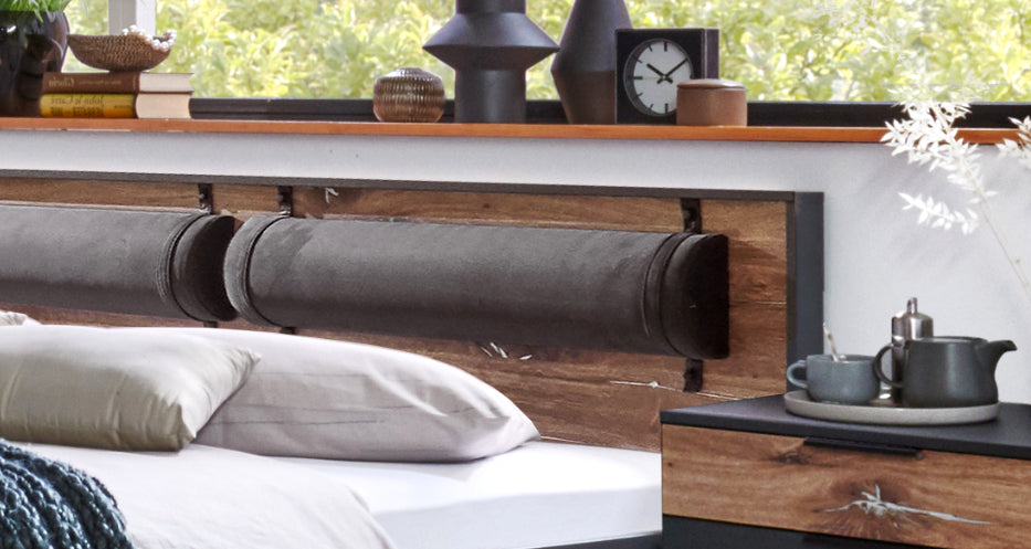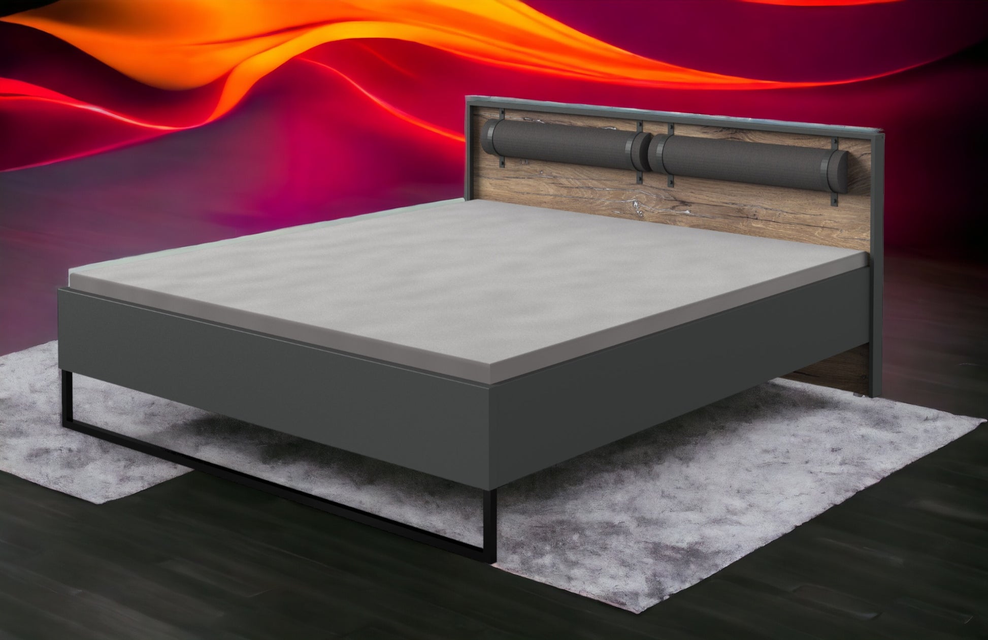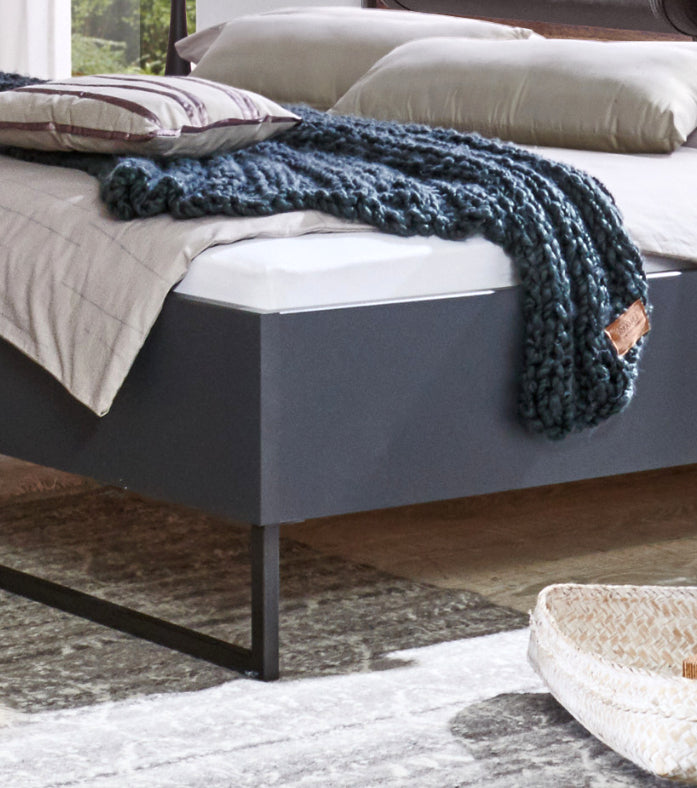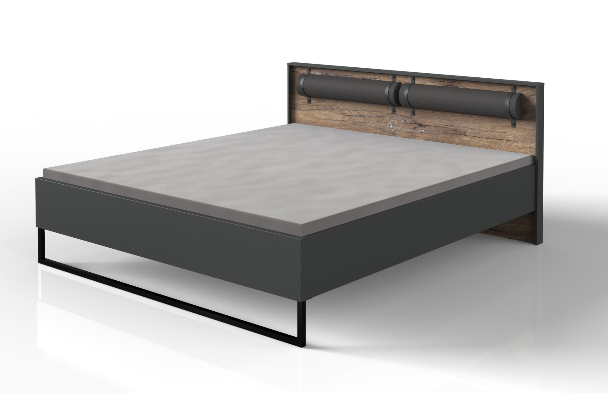 Dekor: Bettpolster Kunstleder Rocket Grey. Korpus Graphit, Abs. Flagstaff-Eiche-Nachbildung. Ohne Deko, Lattenroste und Matratzen.