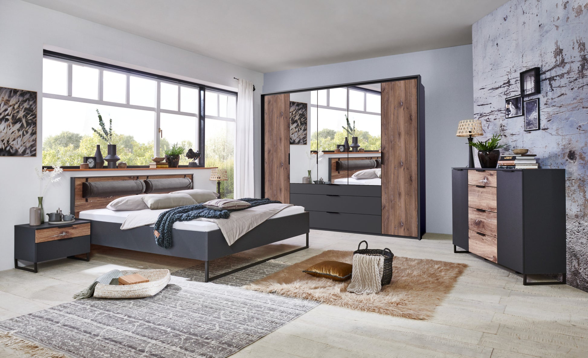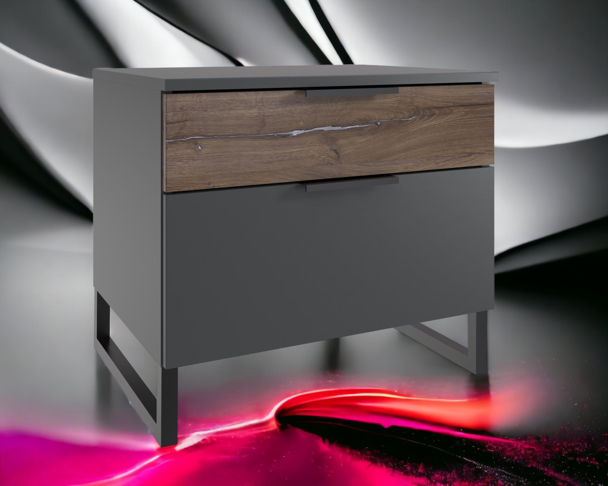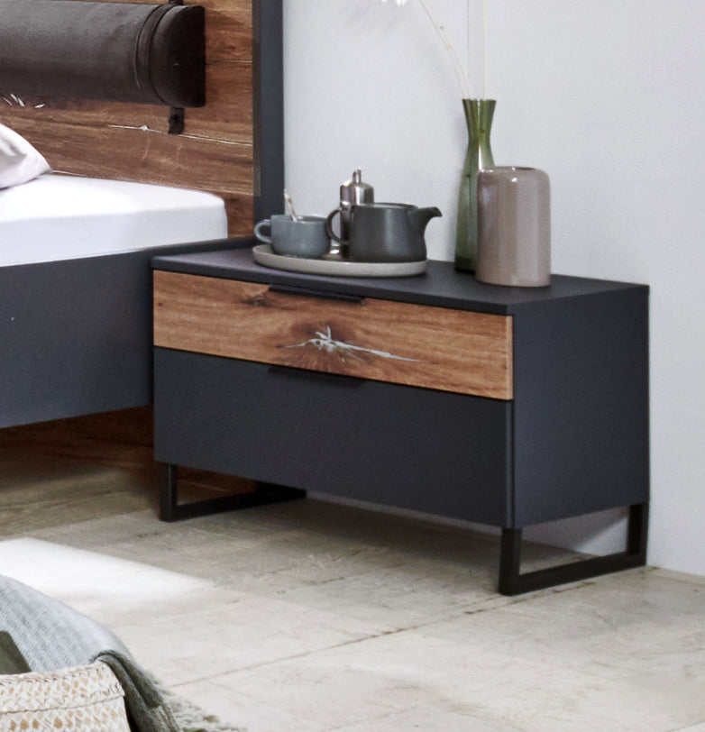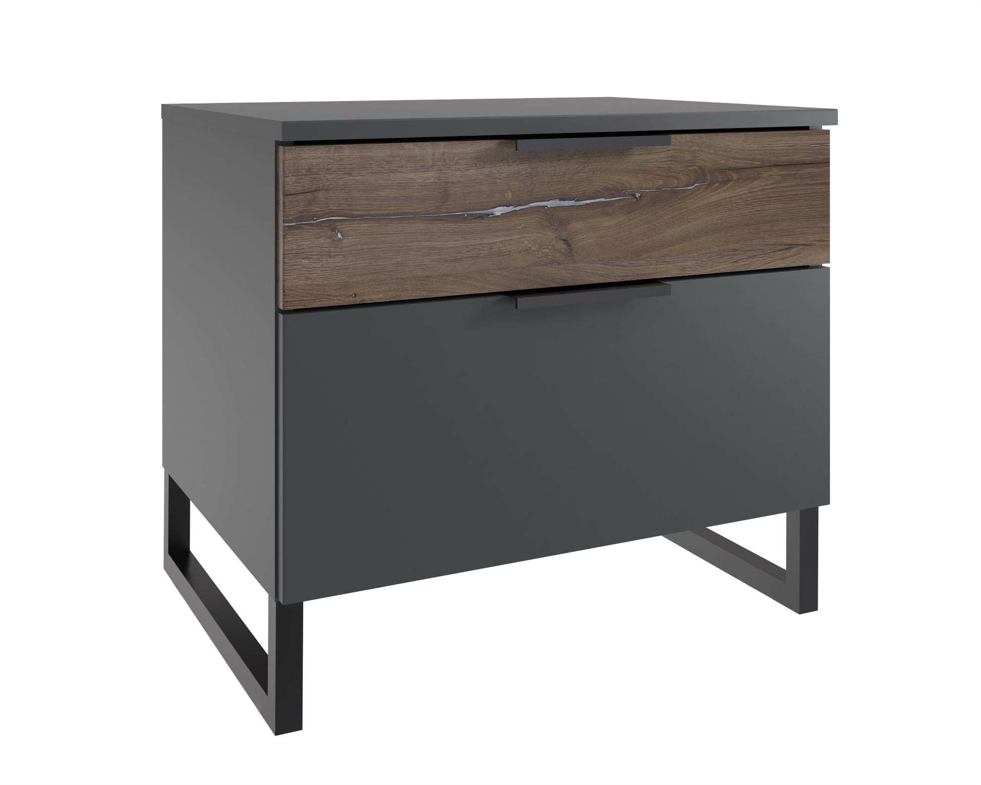 Mit 2 Schubladen. Dekor: Front Flagstaff Eiche Nachbildung, Korpus Graphit, Abs. Graphit, Metallkufen schwarz lackiert.