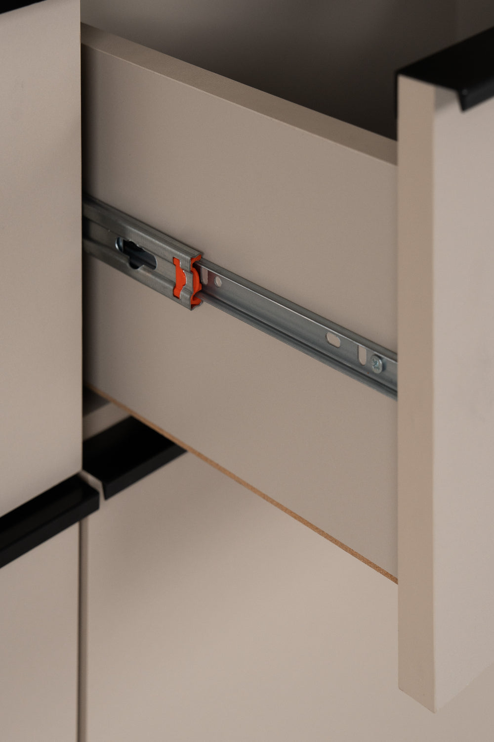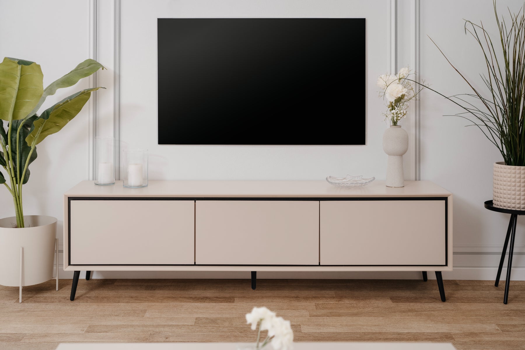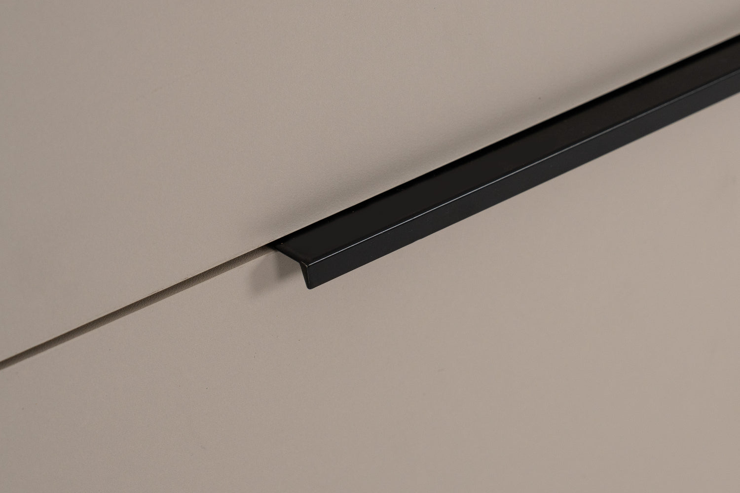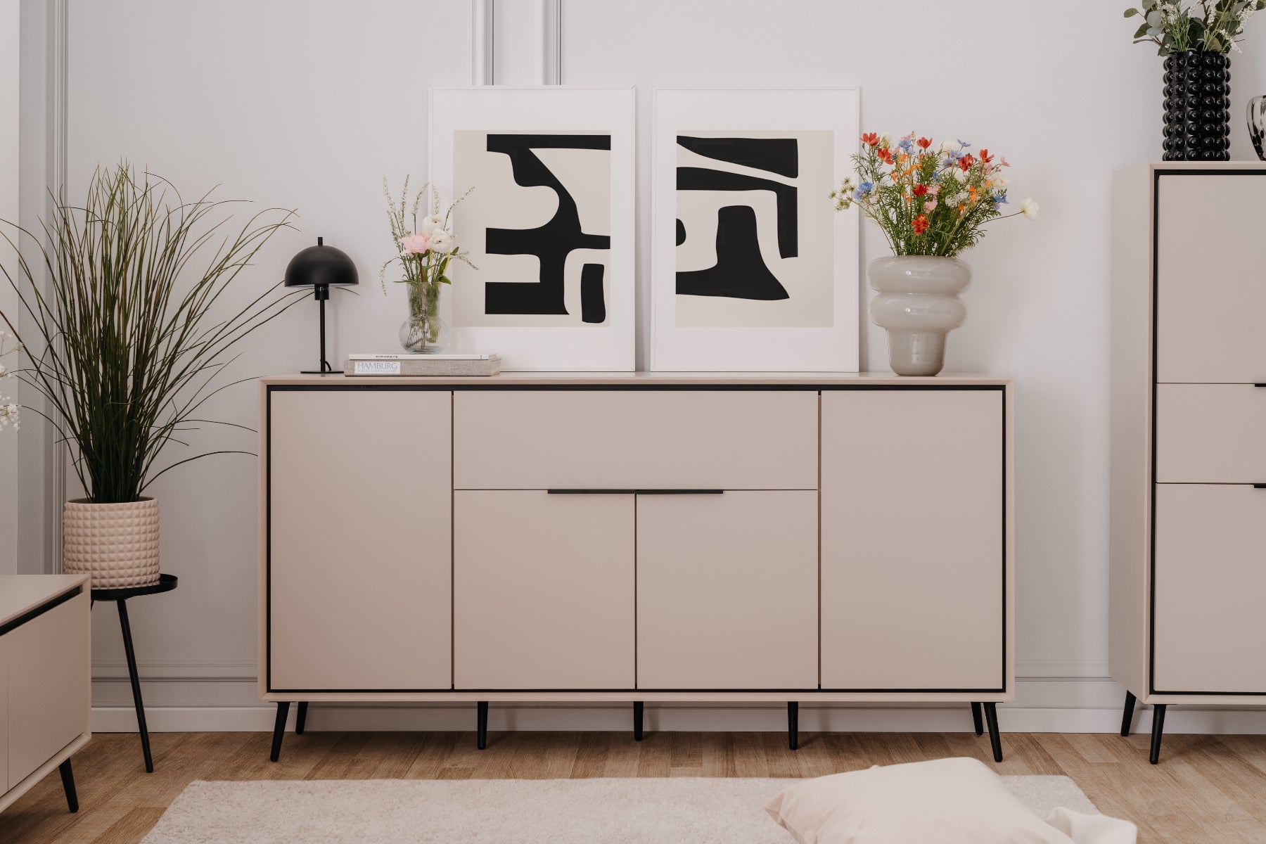 4-teilig, Dekor: Sandfarbig mit Schwarzen Metallfüße. Besteht aus: TV-Lowboard (B/H/T ca. 175 x 50 x 38 cm), Sideboard (B/H/T ca. 175 x 90 x 38 cm), Highboard (B/H/T 90 x 140 x 38 cm), Couchtisch mit 2 Schubladen (B/H/T ca. 94 x 40 x 55 cm). Griffe: Teilweise grifflos oder schwarze Griffe. Die Türen und Schubladen haben Soft-Close-Funktion.