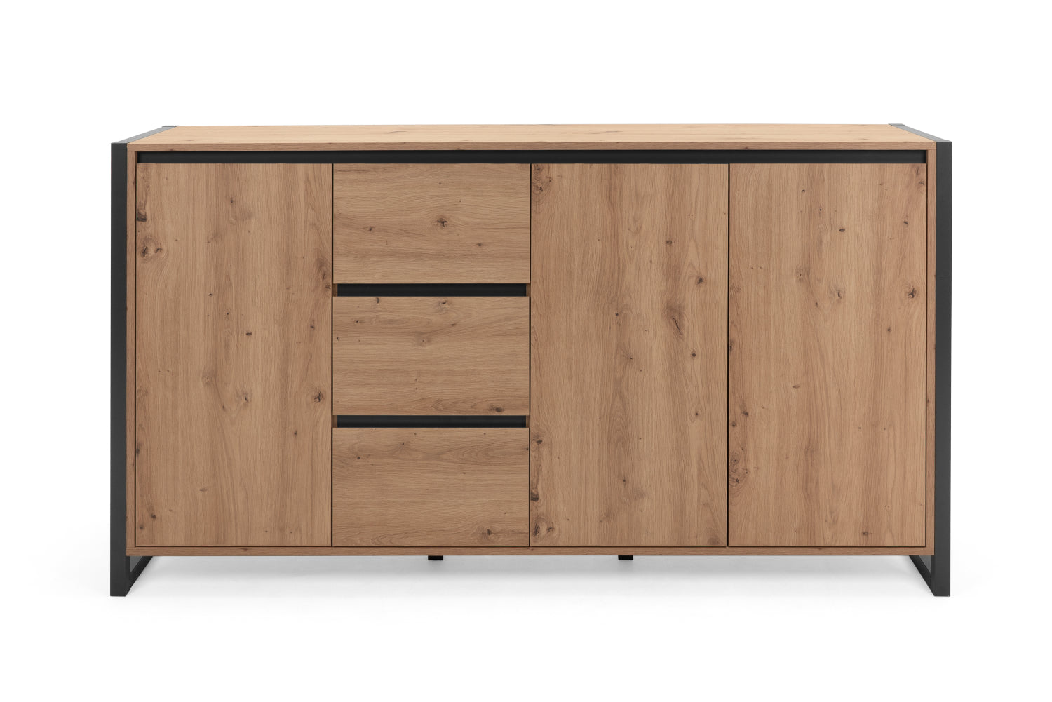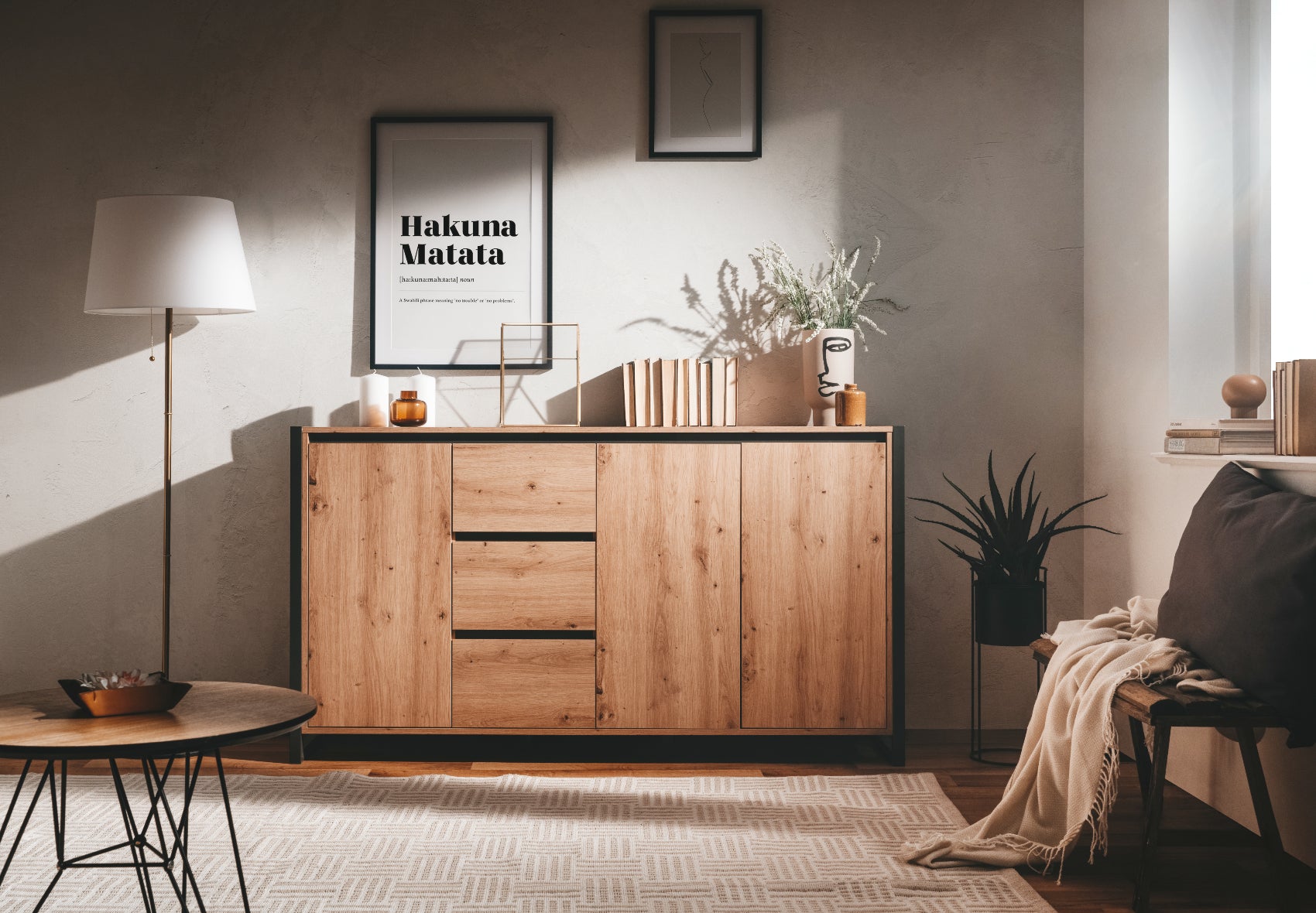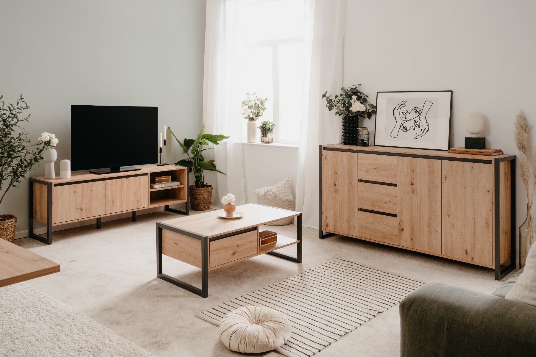 3-teilig, Dekor: Artisan-Oak und MDF-Rahmen in Anthrazit. Besteht aus: TV-Lowboard (B/H/T ca. 160 x 55 x 40 cm), Sideboard (B/H/T ca. 160 x 88 x 40 cm), Couchtisch mit 1 Schublade (B/H/T ca. 100 x 40 x 55 cm). Griffe: grifflos.