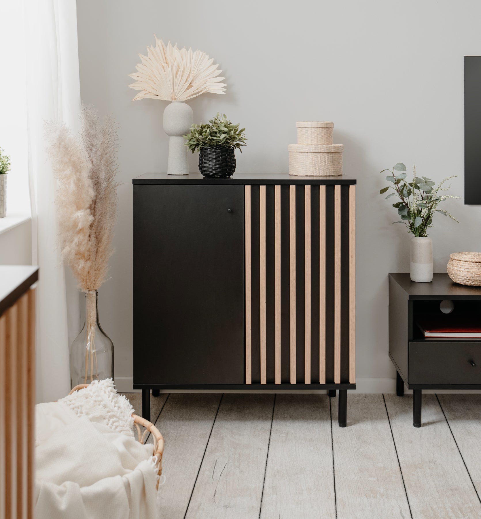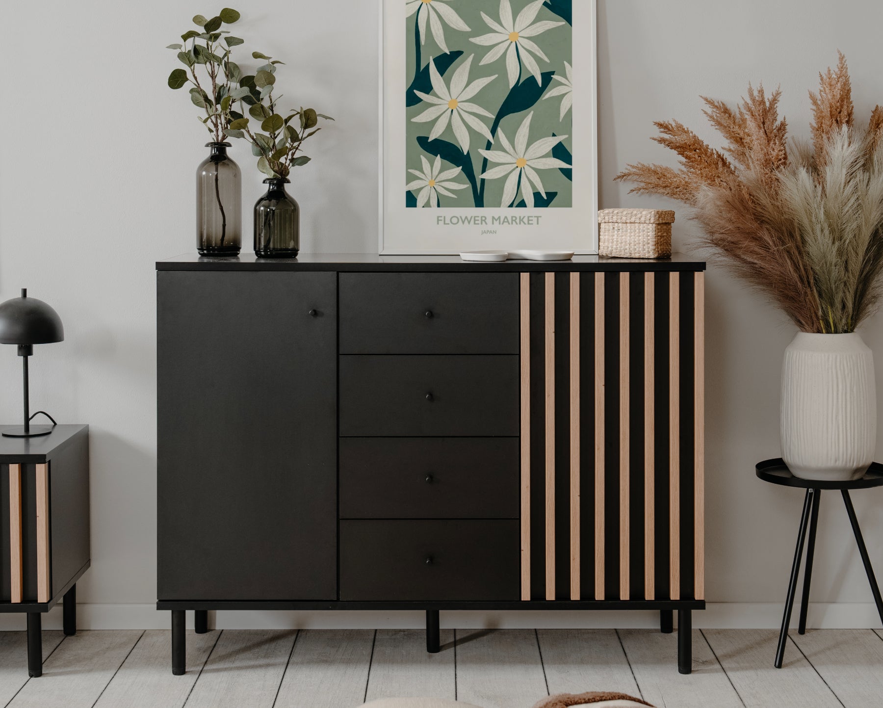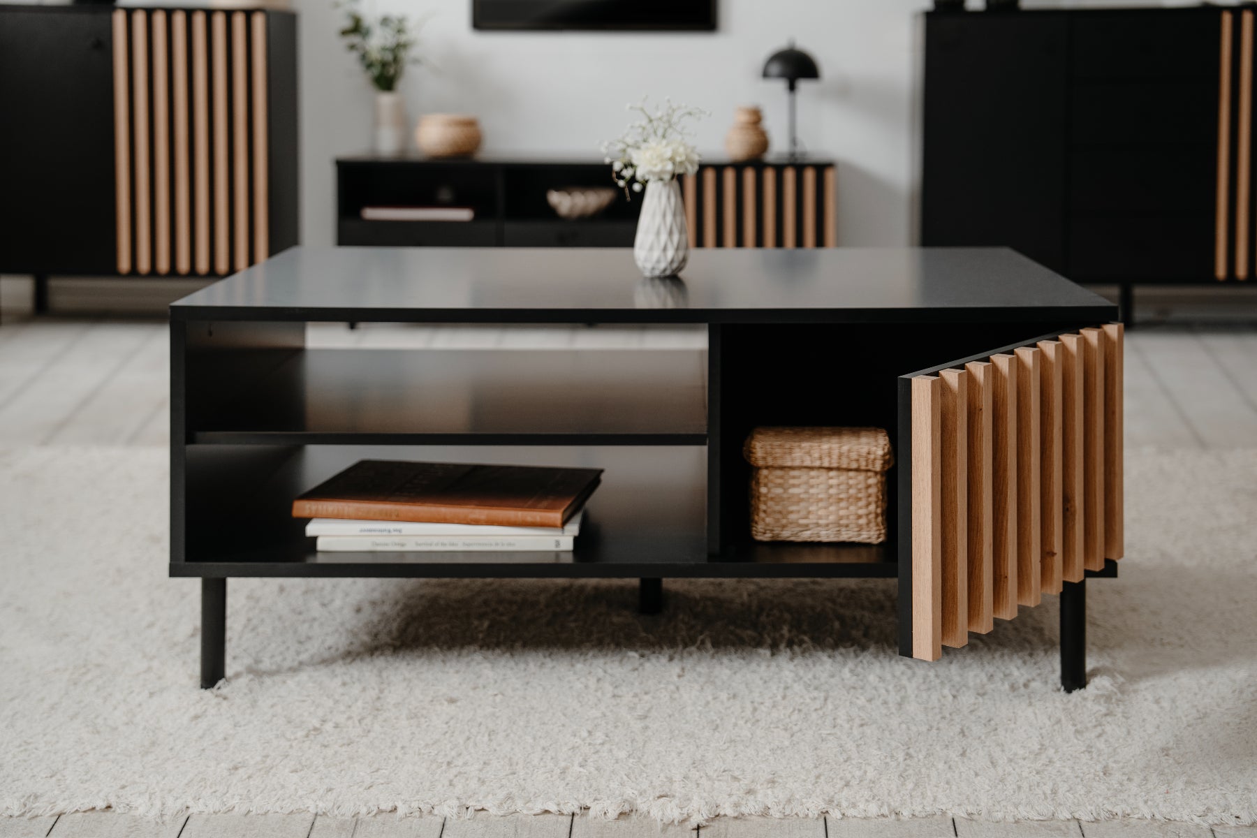 Das Wohnzimmer-Set Finori Monza Schwarz/Artisan-Oak mit Lamelenelementen 4-teilig ist eine luxuriöse Kombination aus handgefertigten Holzlatten in eleganter Optik und edlen Metallknöpfen als Griffe. Ein Hauch von Kunst und Literatur wird in Ihr Zuhause gebracht, während das Set Ihrem Wohnzimmer ein exklusives und stilvolles Ambiente verleiht. Das moderne und stilvolle Design überzeugt nicht nur auf visueller Ebene, sondern auch durch seine hochwertige Verarbeitung. Das 4-teilige Set besteht aus einem TV-Lowboard, einer Kommode (A), einer Kommode (B) und einem Couchtisch, alle mit Lamelenelementen, für eine elegante und exklusive Wohnraumatmosphäre.